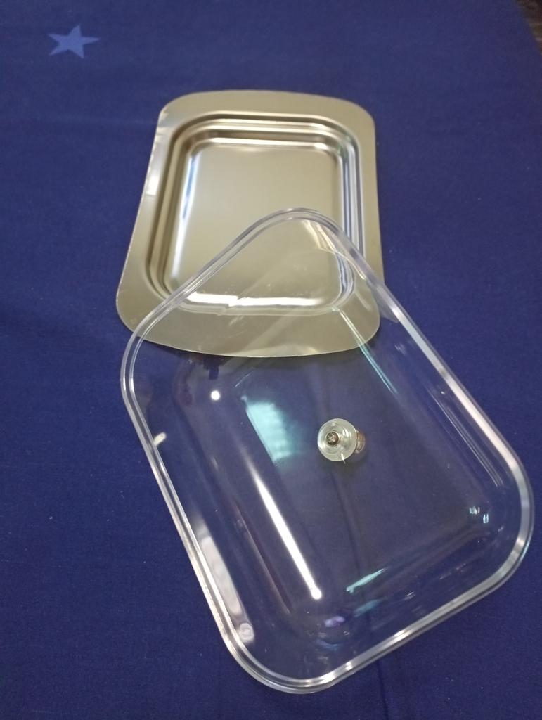 The oil container, the tray itself is made of high-quality stainless steel, the lid is made of high-quality transparent plexiglass with a stainless steel handle. I am very pleased with the product, it can be used both for storing butter and for storing cheese.