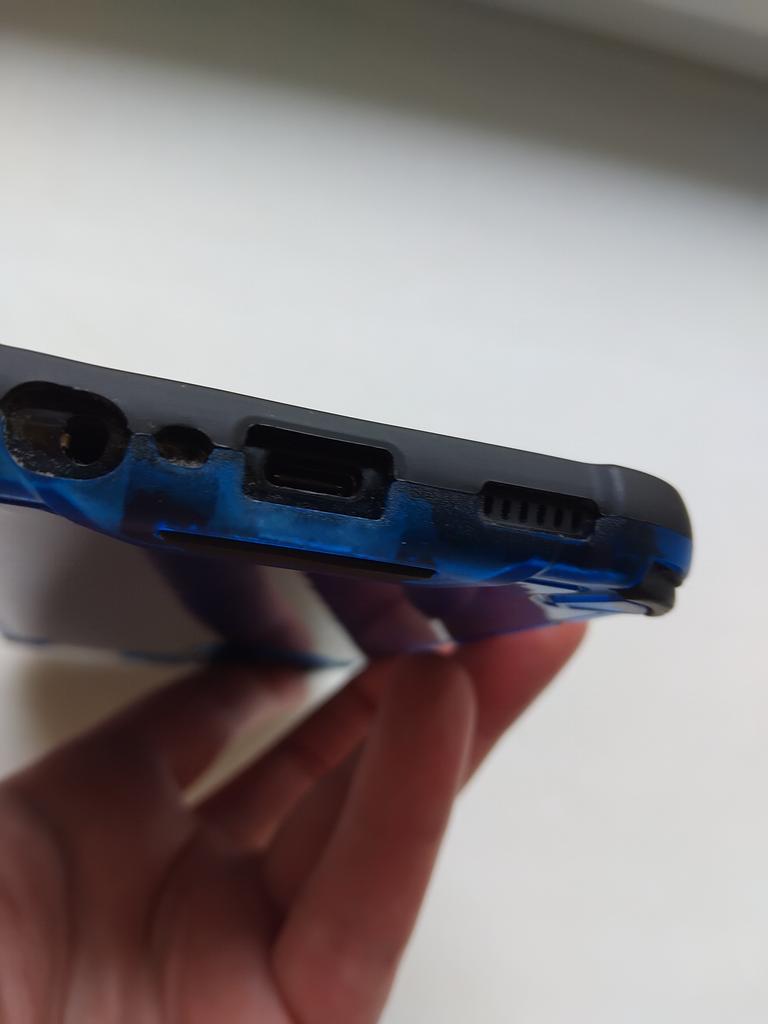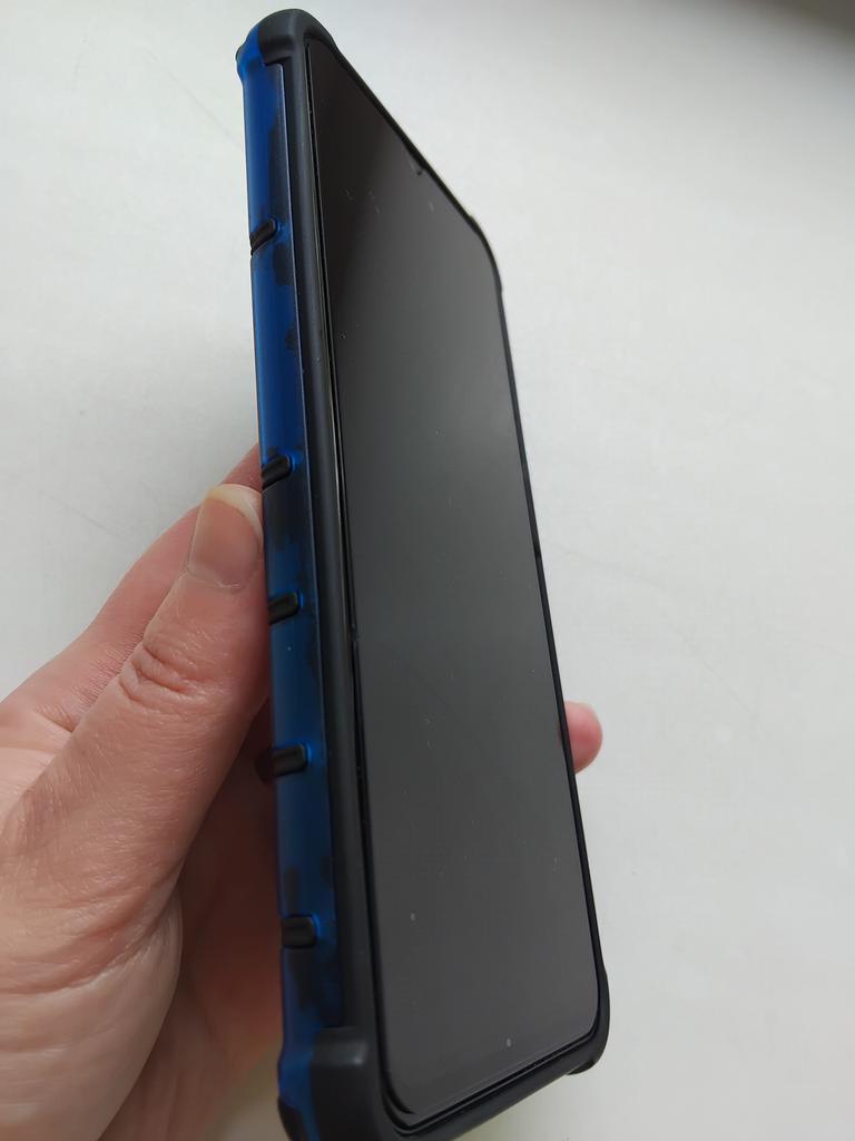 The case is generally transparent, but even on a black phone the color is noticeable. Corners, contour and camera are reinforced with plastic. It fits perfectly. But the blue part is slippery.
