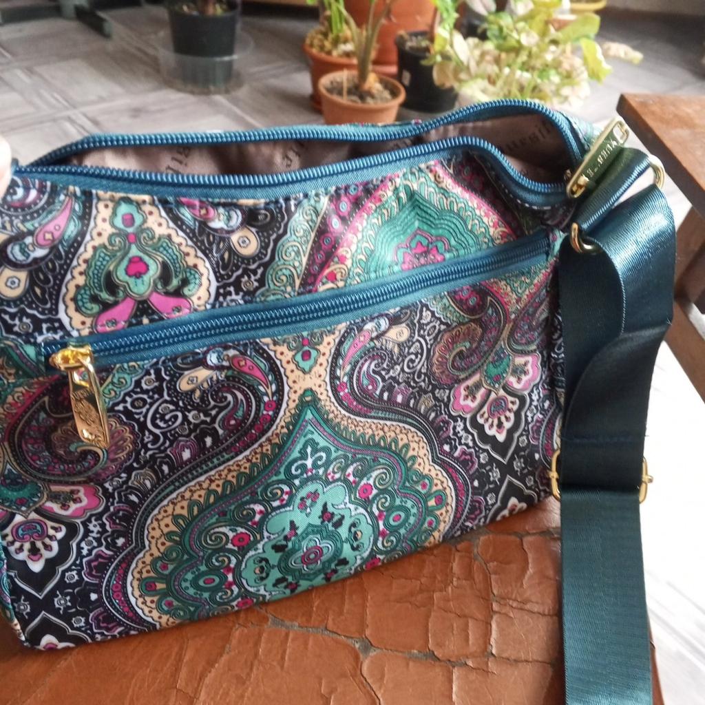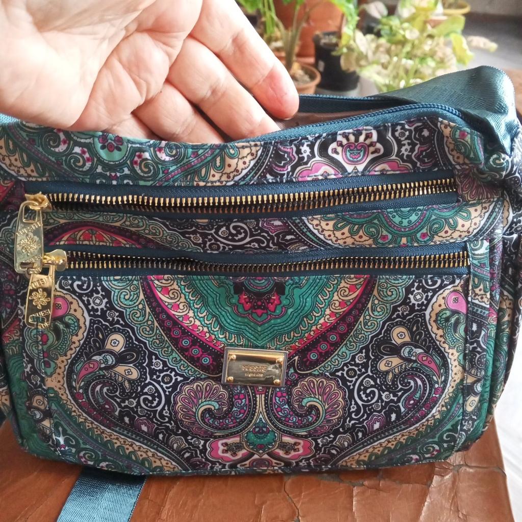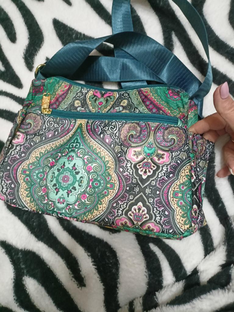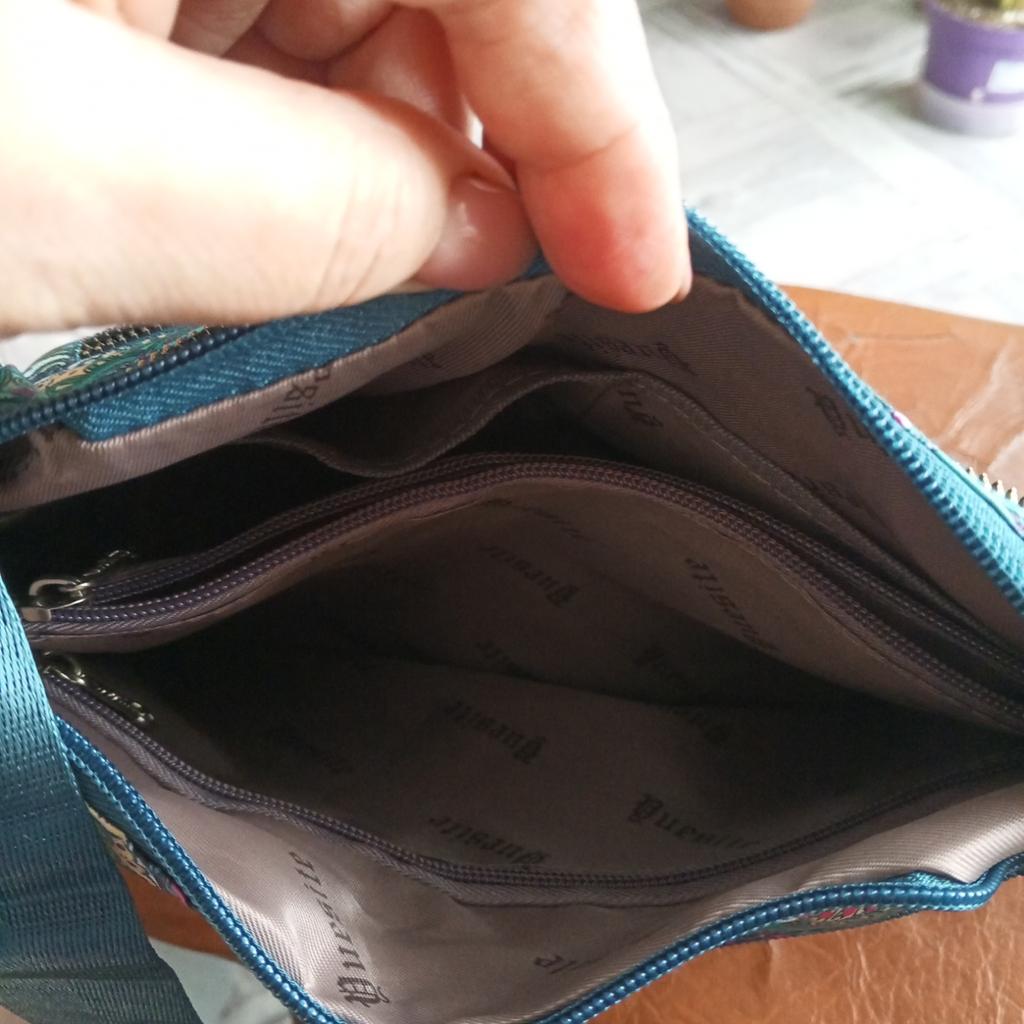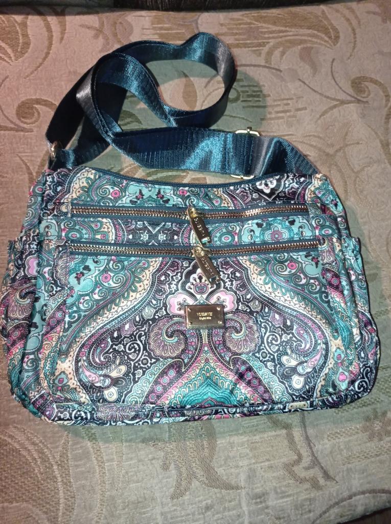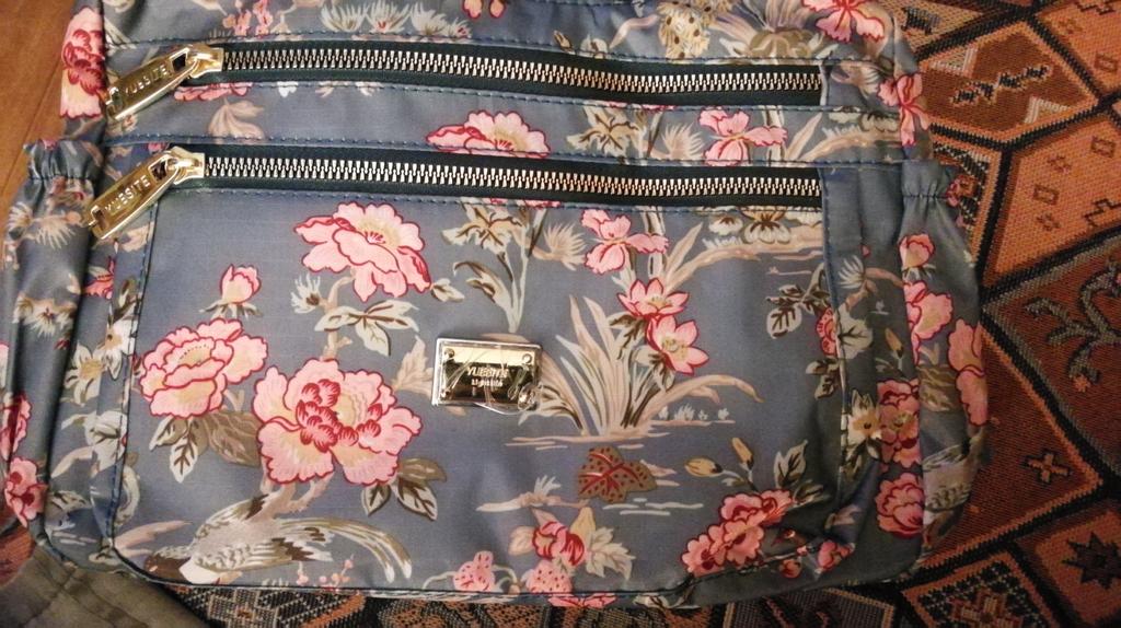 Crossbody bag, matches the photo, blue with pink flowers and birds, very functional, many pockets, I recommend for purchase. Thank you!