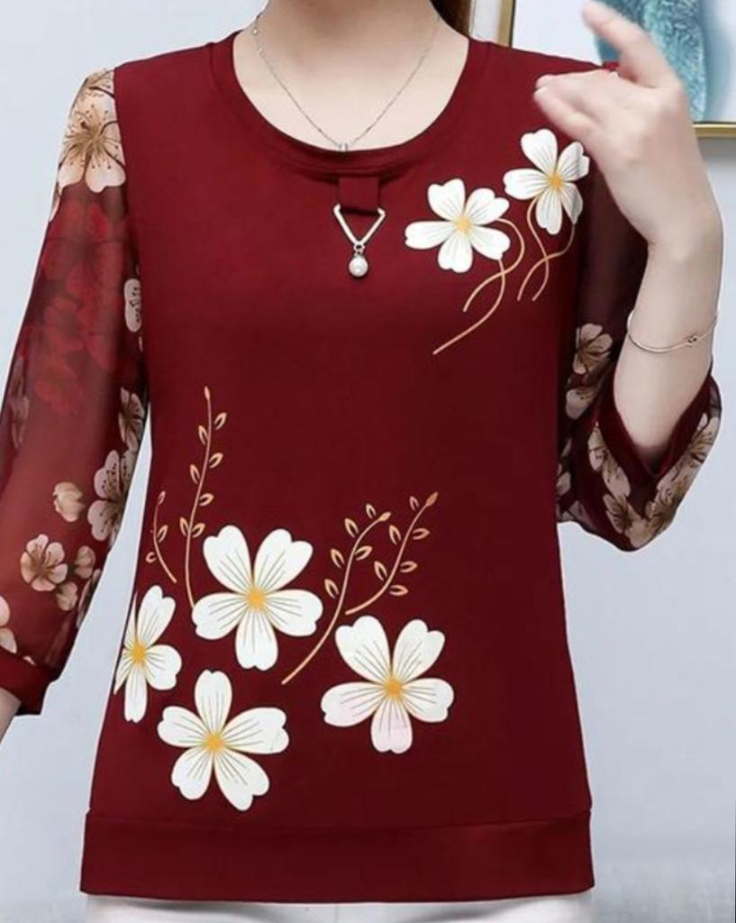 WTEMPO Spring Summer Chiffon Shirts Women's 3/4 Sleeve Flower Printed T-Shirts Female Casual Loose Thin Bottoming Tops
