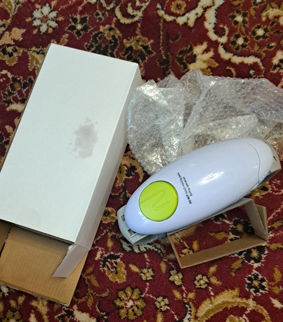Inside the packaging film, on the box, there is a greasy stain, the opener itself is also somewhat greasy. It feels like lubricant has leaked out of it. But it works. It opens cans..