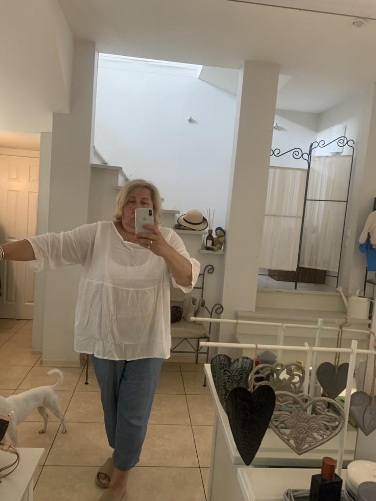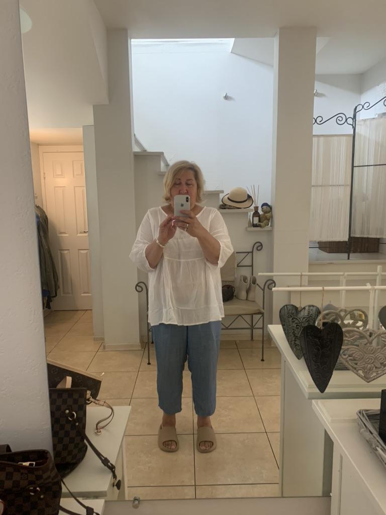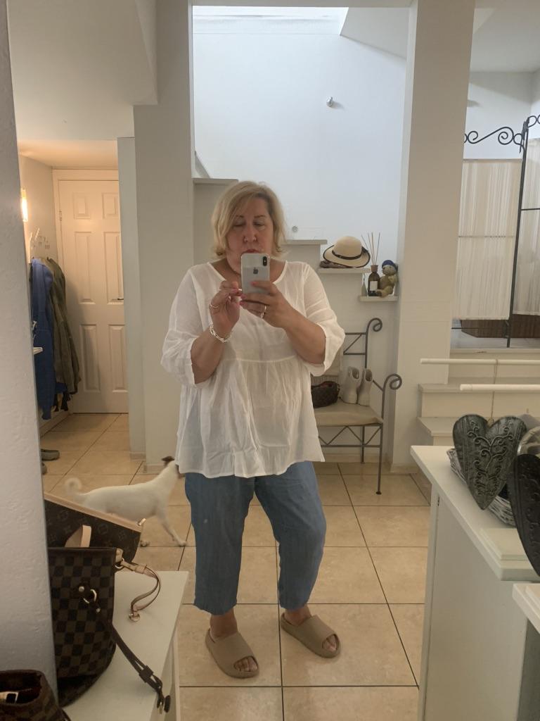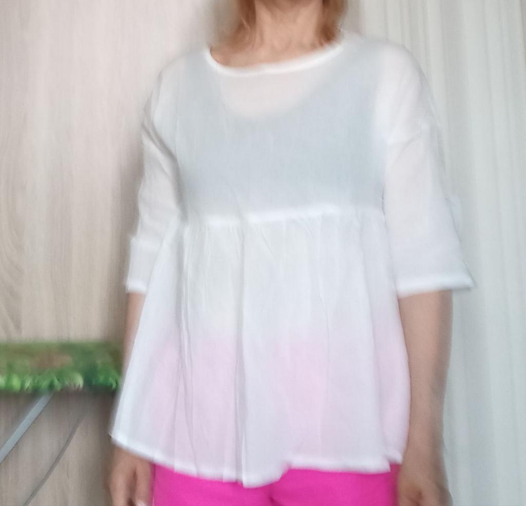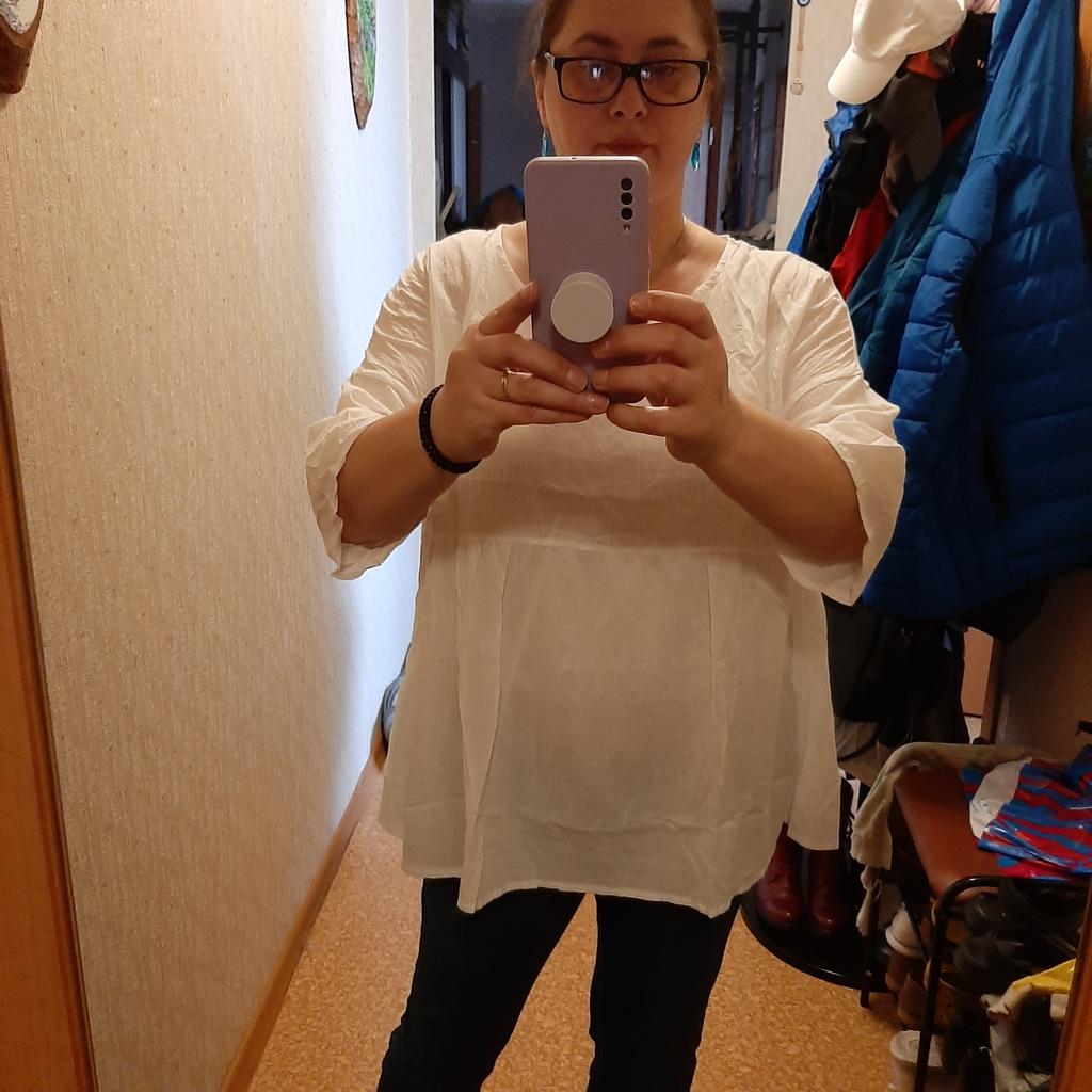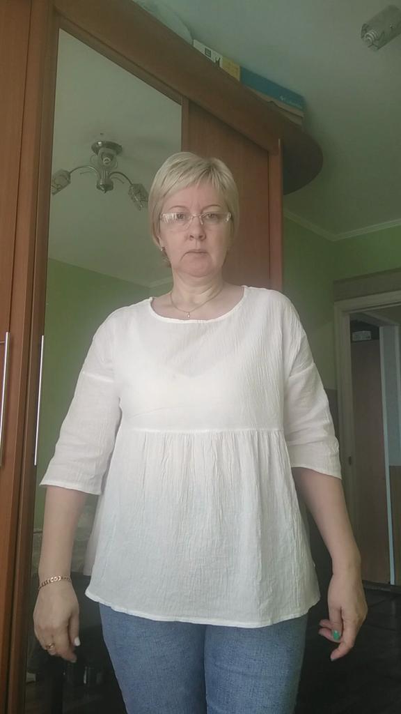 My size is 52-54 (chest circumference 107 cm). The blouse looks good, is loose, just right for summer. I wear it with pleasure with jeans, with wide linen trousers. The material is cotton.