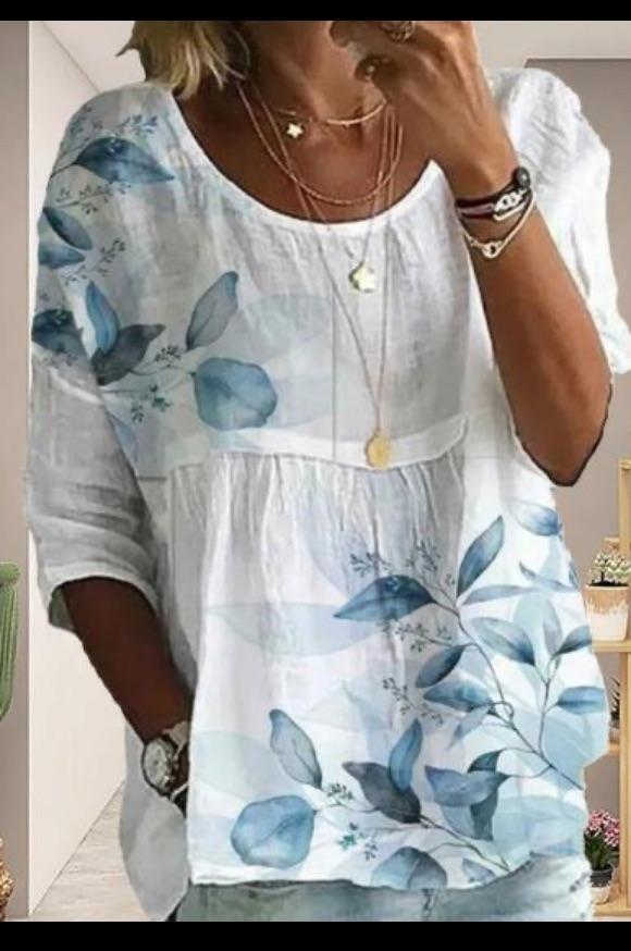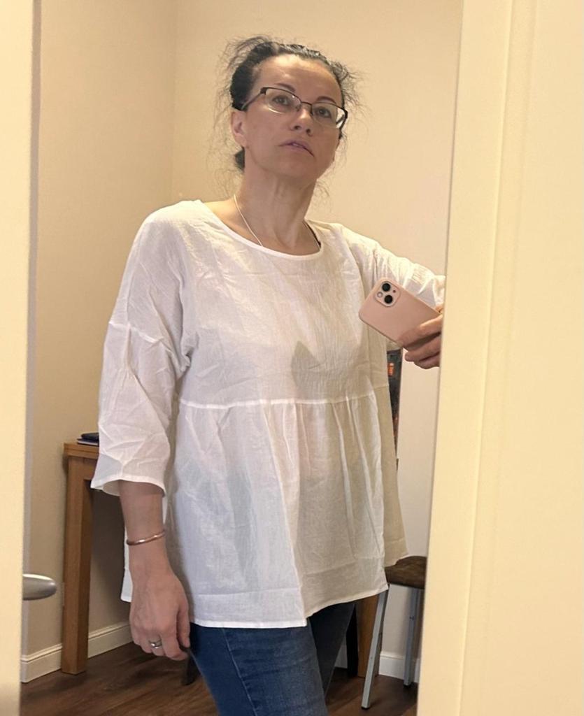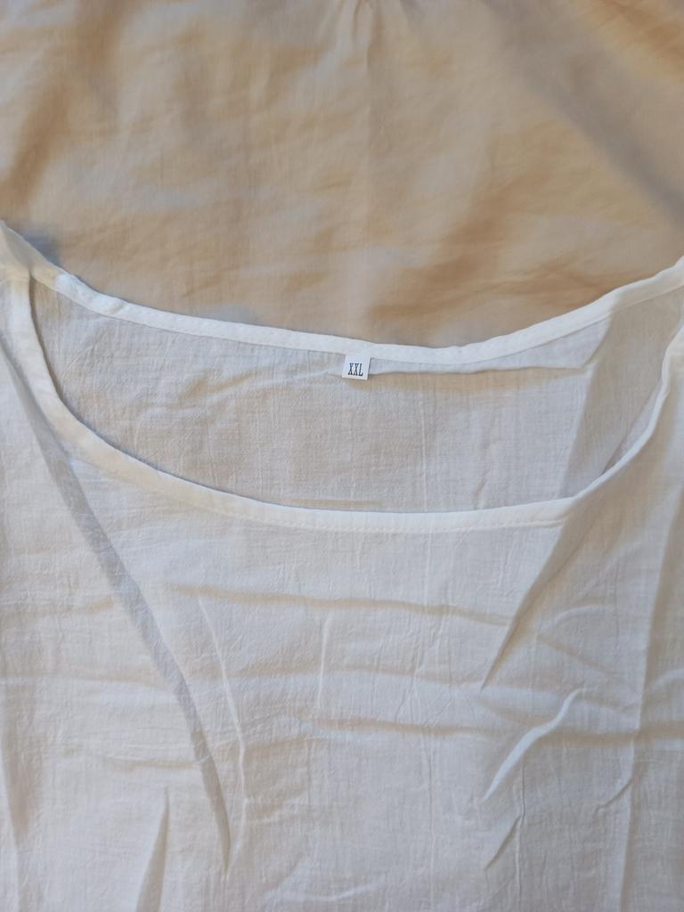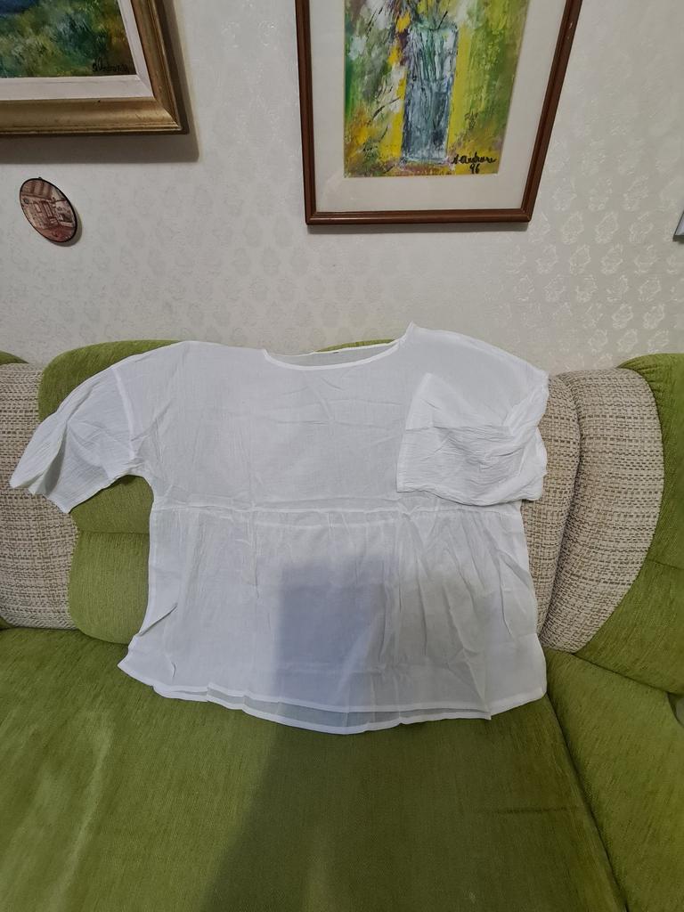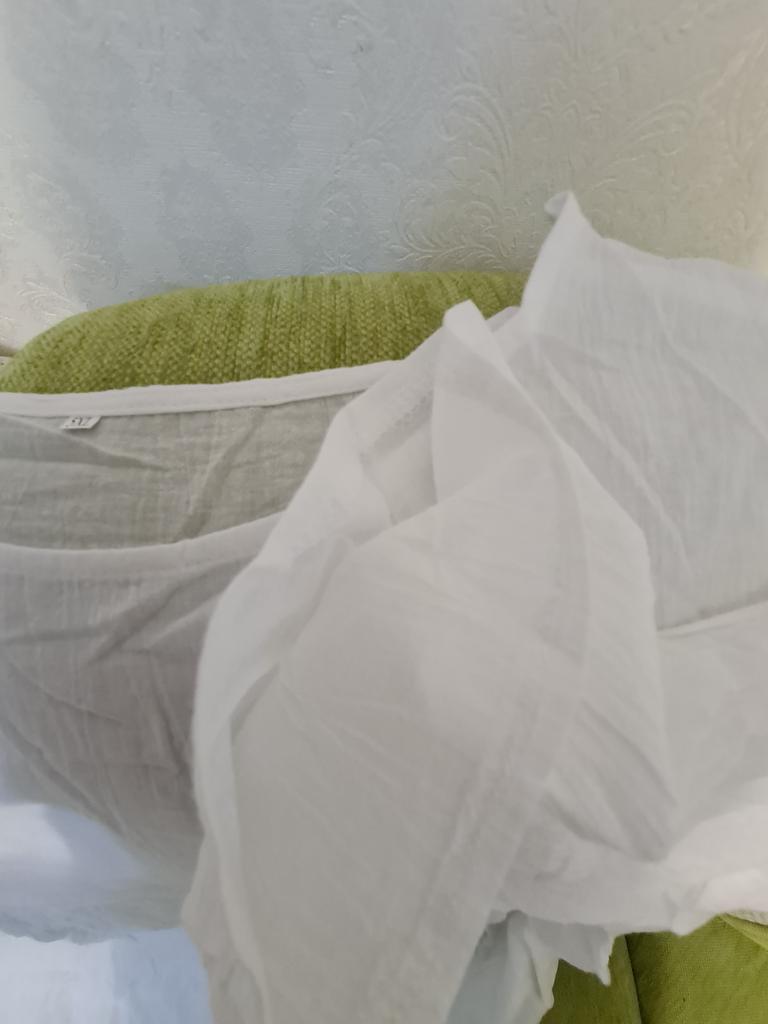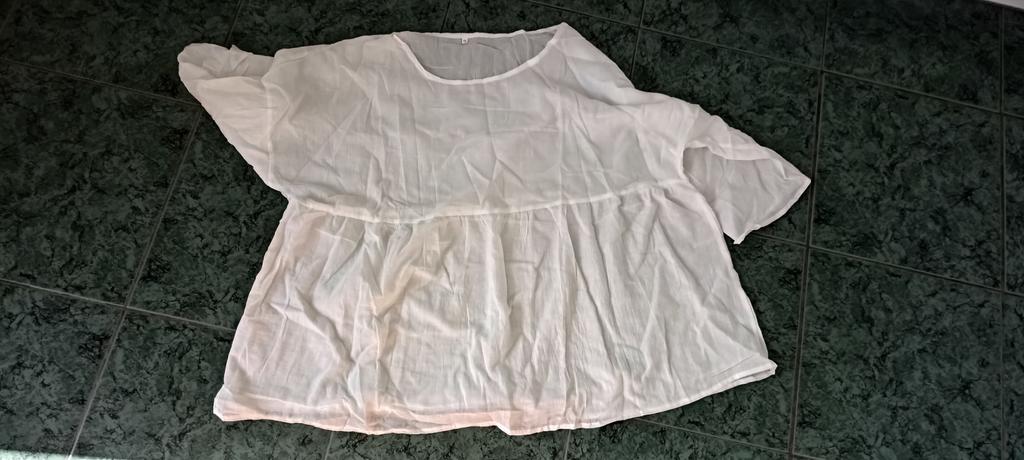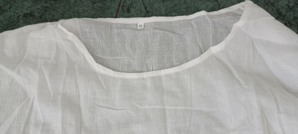 Light, airy, high-quality fabric. The loose fit is ideal for hot weather. L fits size 48 just right. M could also have worked since the blouse has a loose cut.