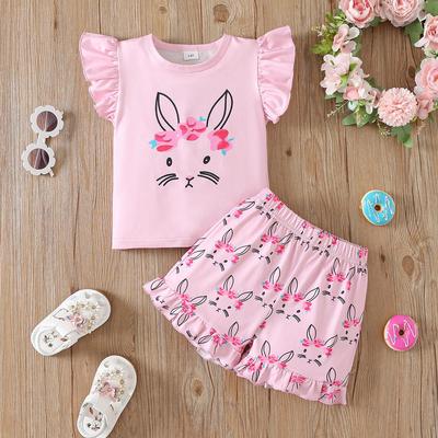Girls' Easter Rabbit Puff Sleeve Summer Set with Cartoon Flowers