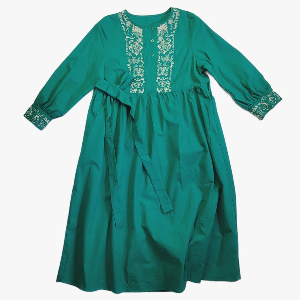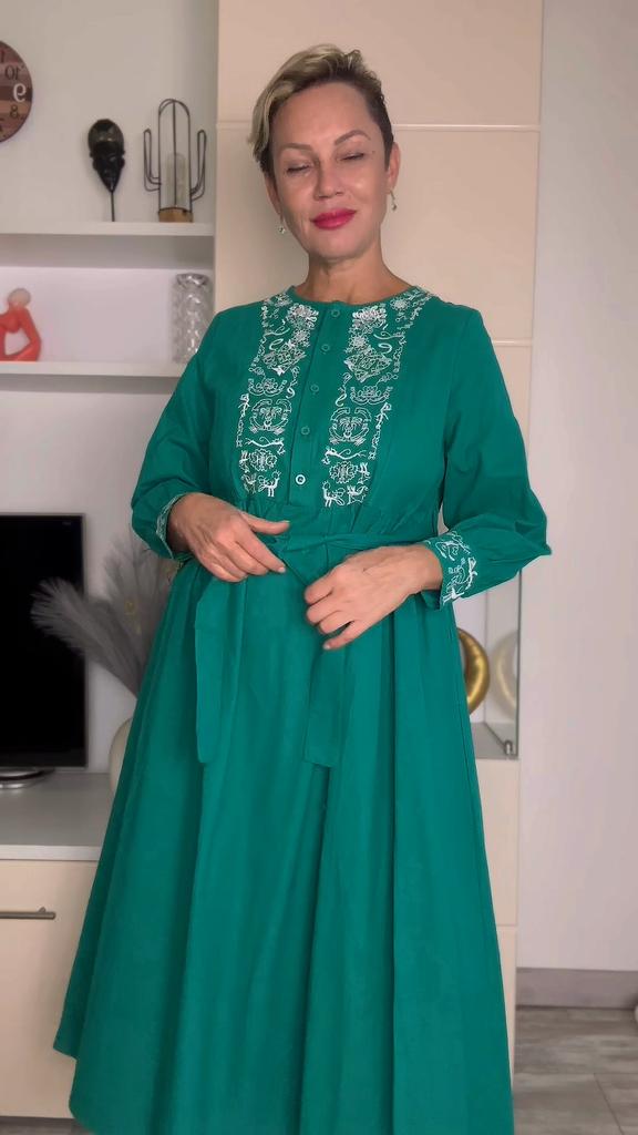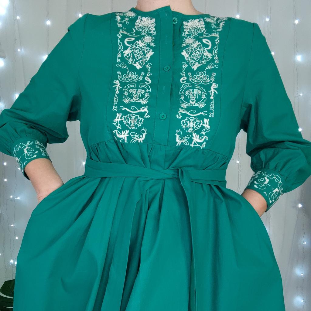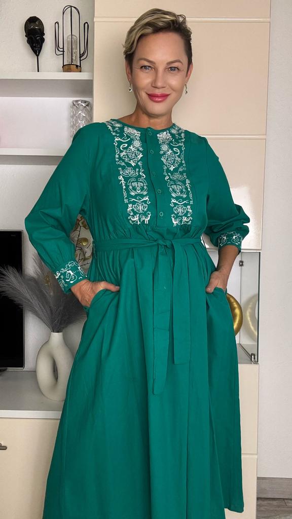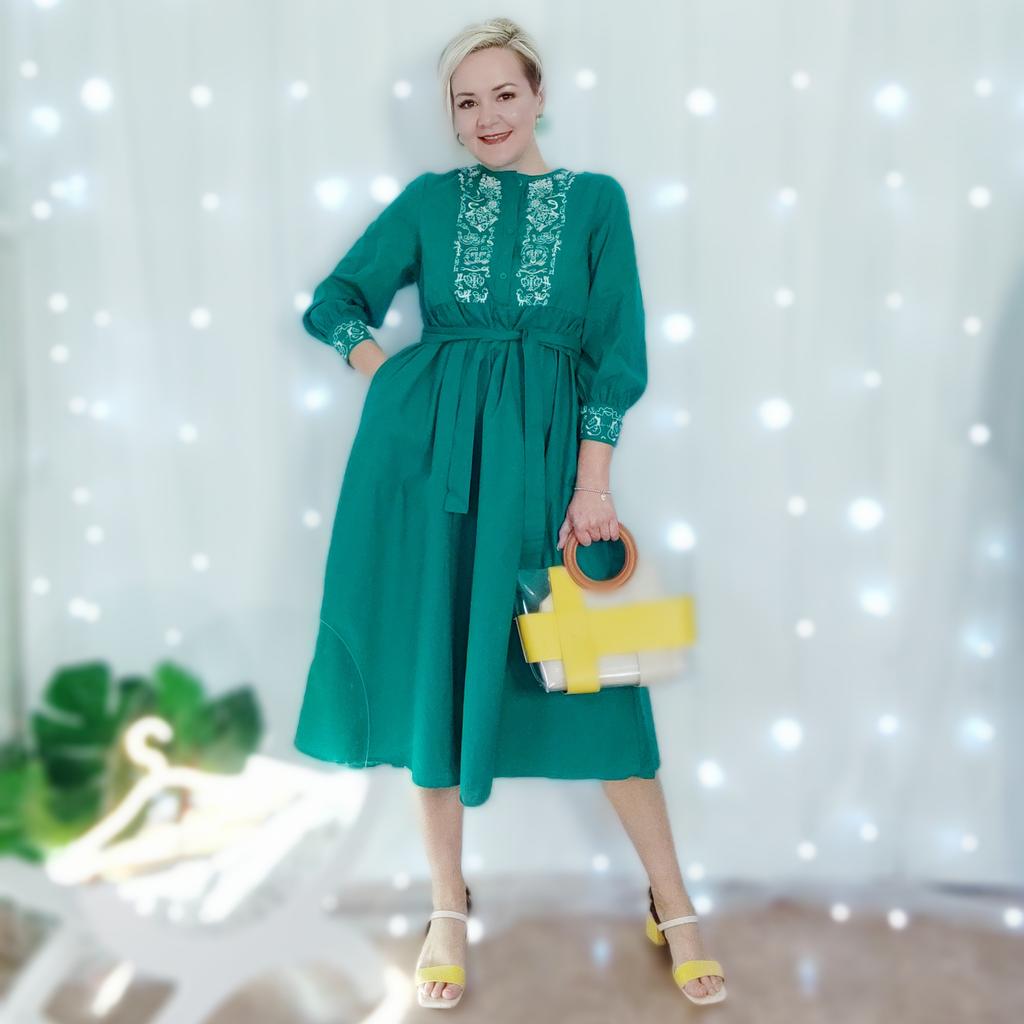Bodycon Dress O Neck Embroidery Puff Sleeve Button Vestidos Ethnic Style Spring Folds Solid Color Dresses A-line