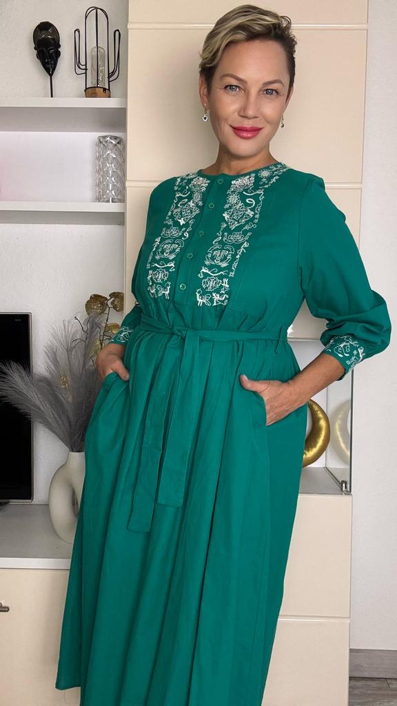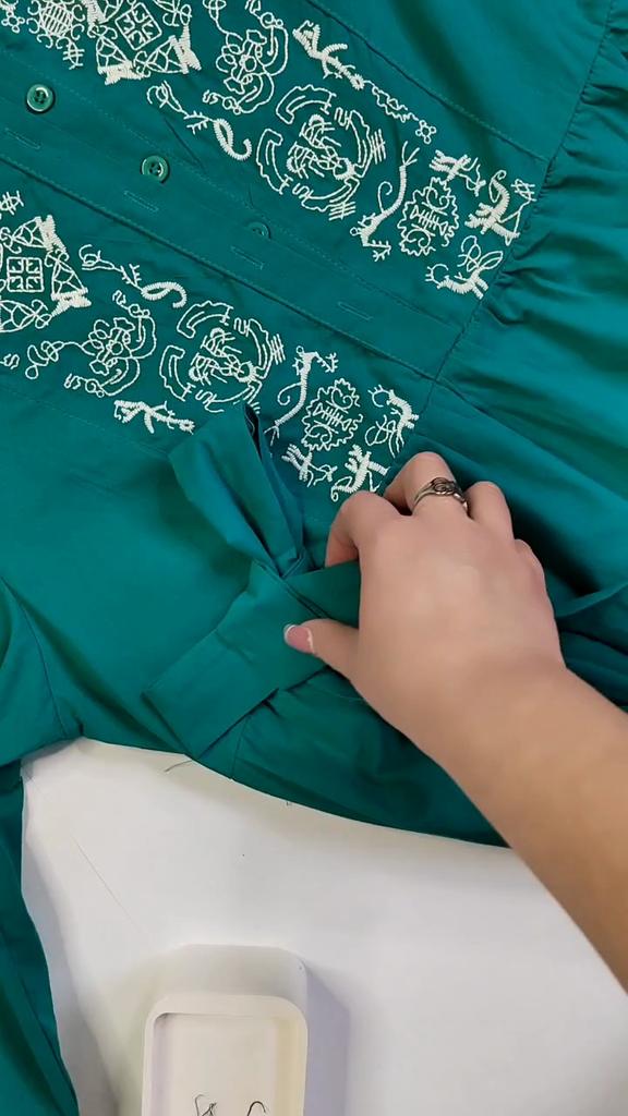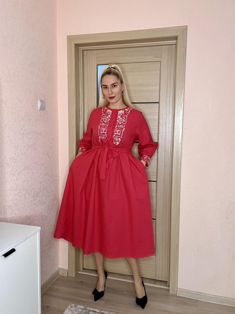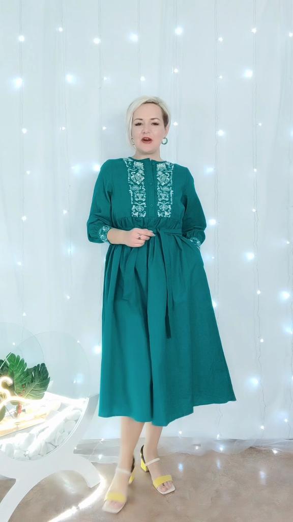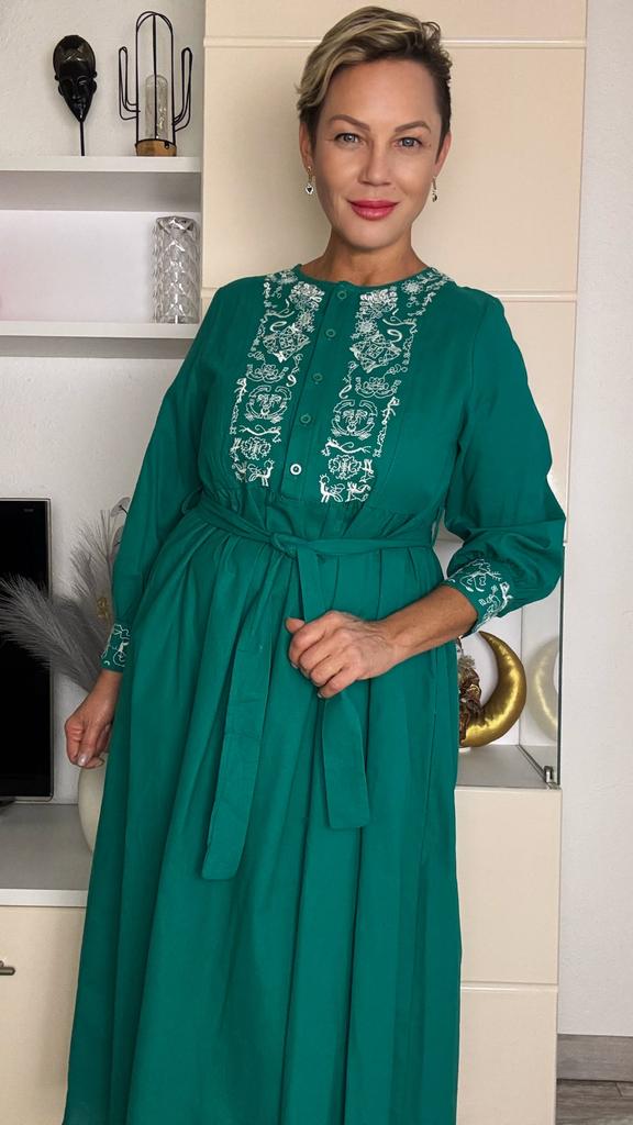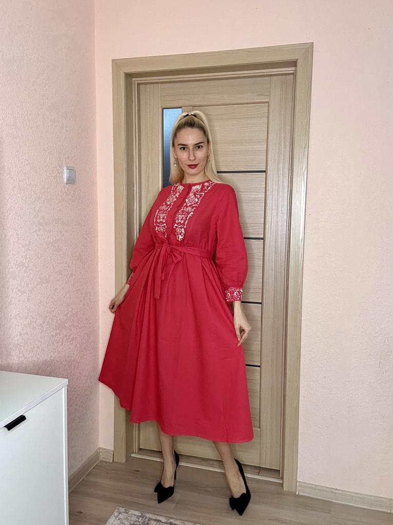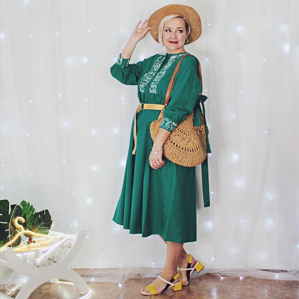Bodycon Dress O Neck Embroidery Puff Sleeve Button Vestidos Ethnic Style Spring Folds Solid Color Dresses A-line