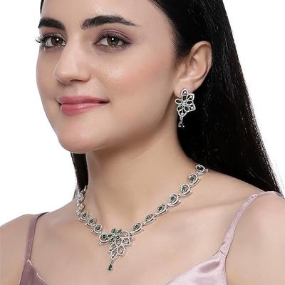 Rhodium-Plated American Diamond Studded Contemporary Necklace With Earrings Jewellery Set For Girls and Women