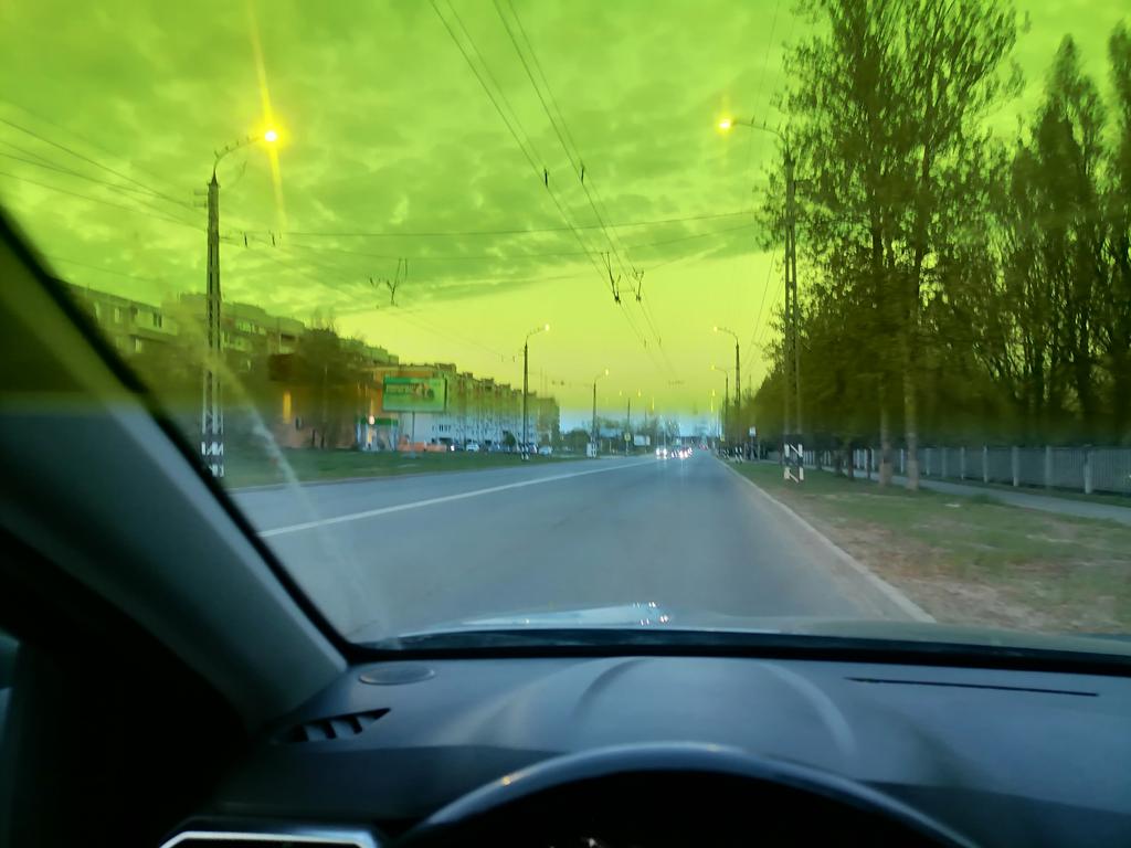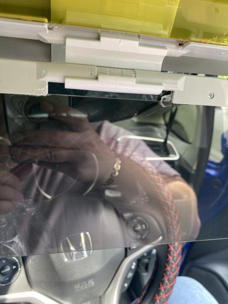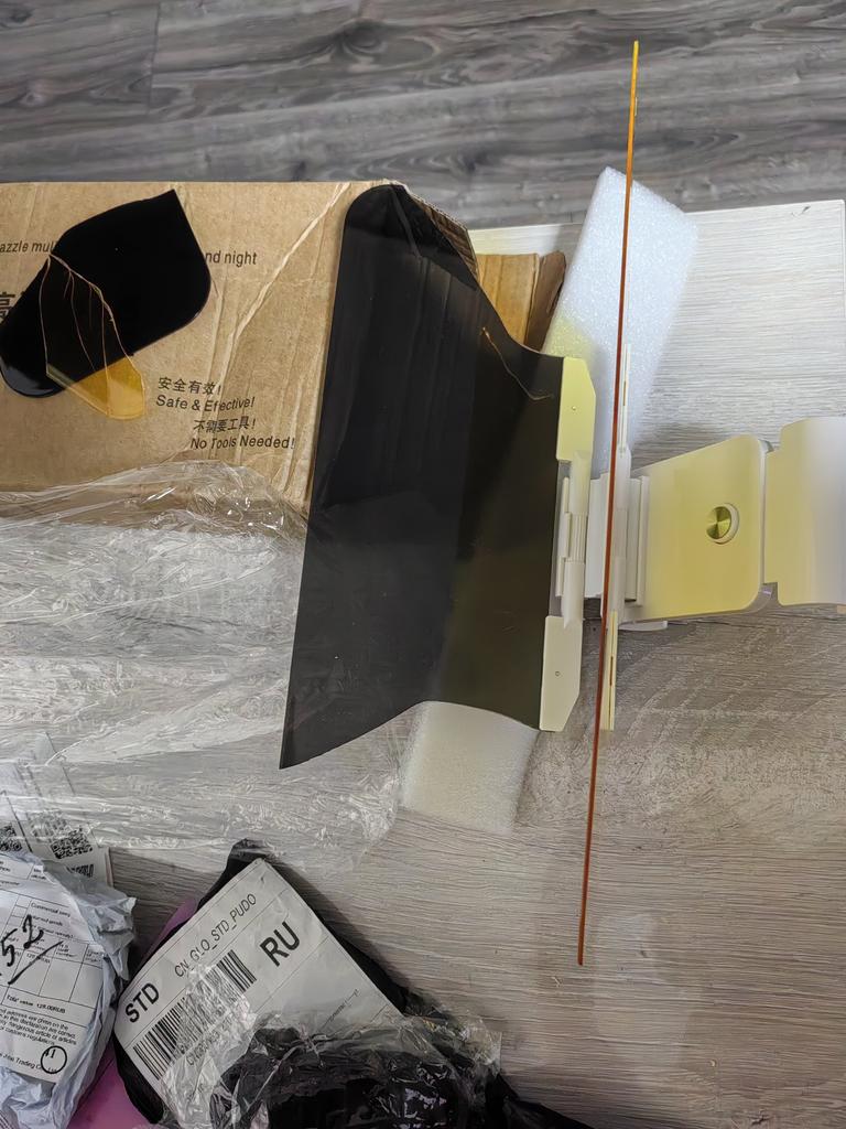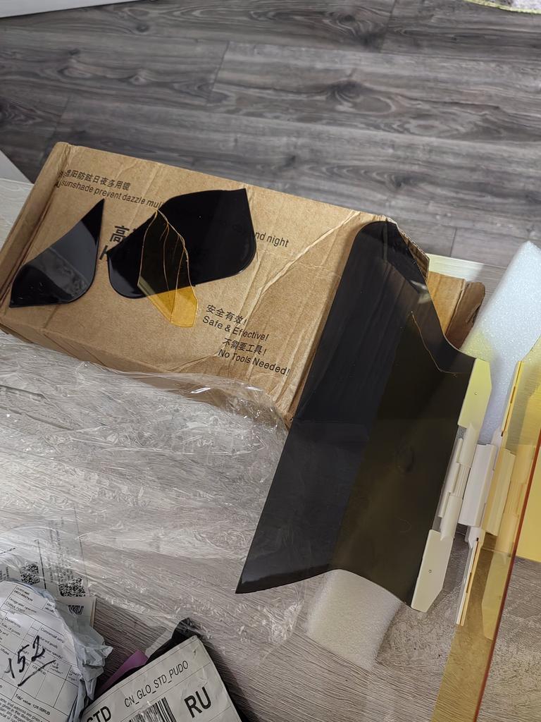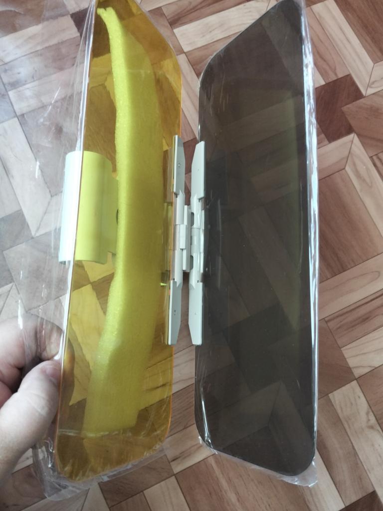 Received a bit with defects, one glass cracked near the mount. But it can be used. Helps from the sun and headlight glare.