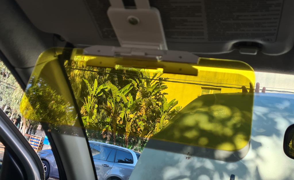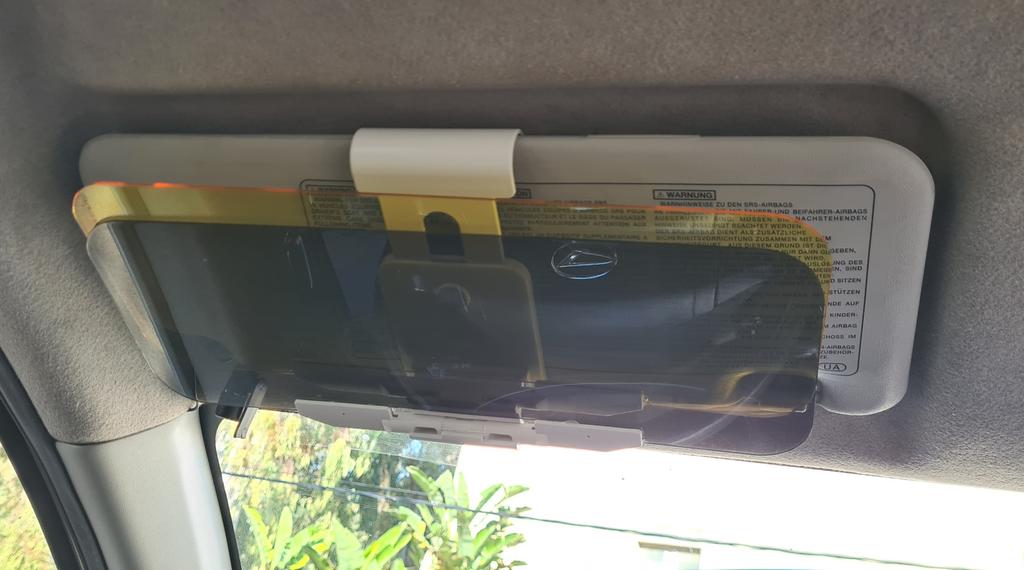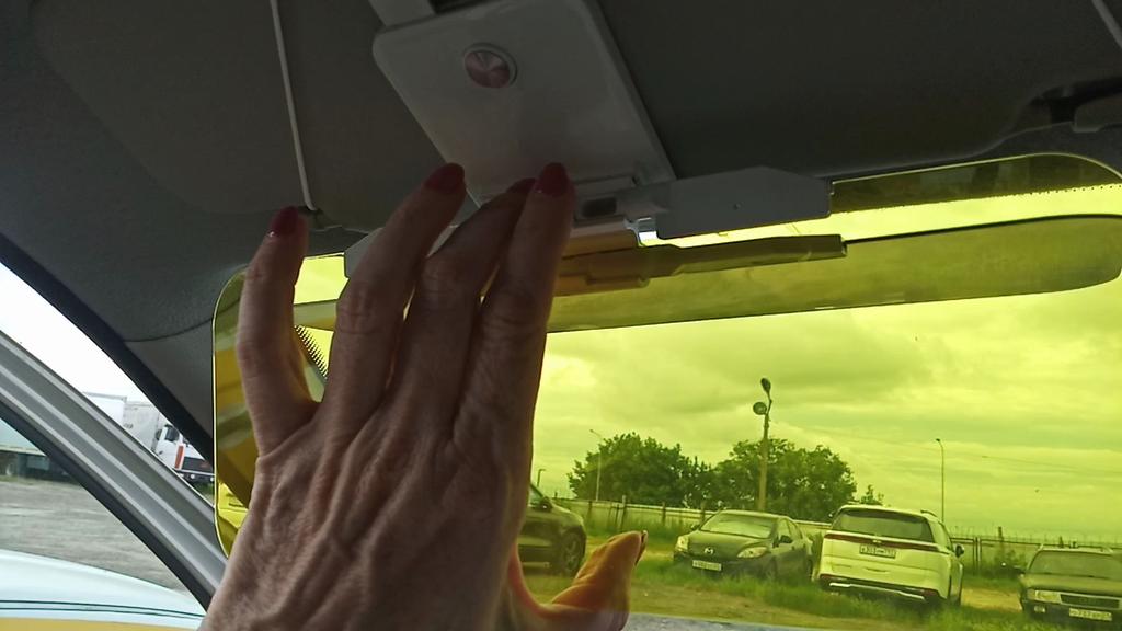 I installed it on the visor with difficulty, the width of the mount is at the limit. When folded, it hangs below the visor, covers 3 cm of the view along the top of the glass, shakes in front of the eyes while driving, not very pleasant. When you completely lower the visor glass, it does not cover the entire field of view, an unprotected part of the windshield remains below. Maybe this is how it was intended, but this difference tires the eyes. But it helps in bright sunlight, and the yellow light filter also protects from blinding. So everyone can weigh all the pros and cons for themselves.