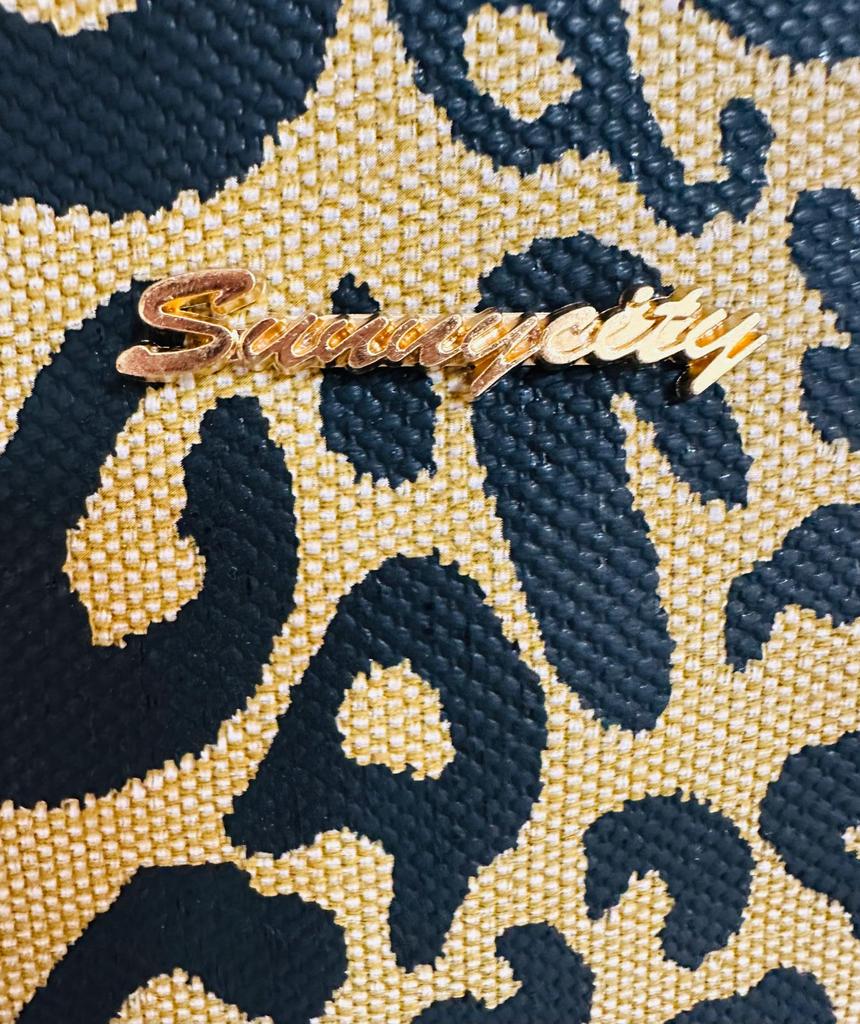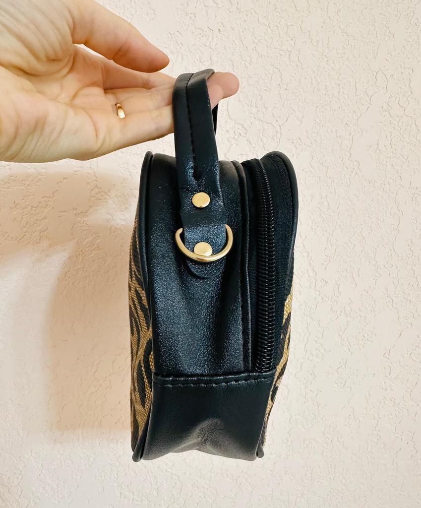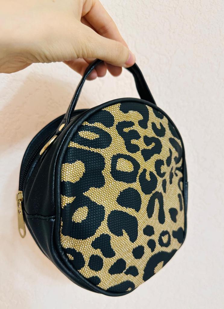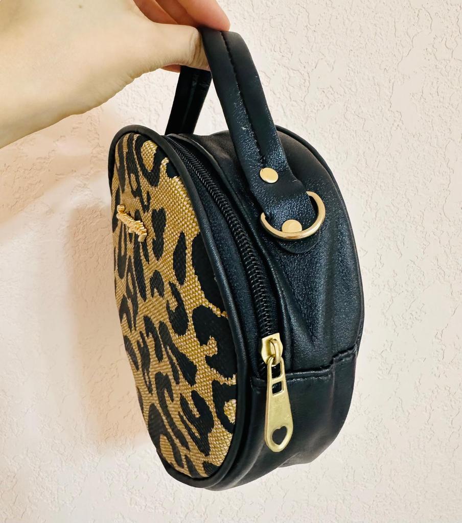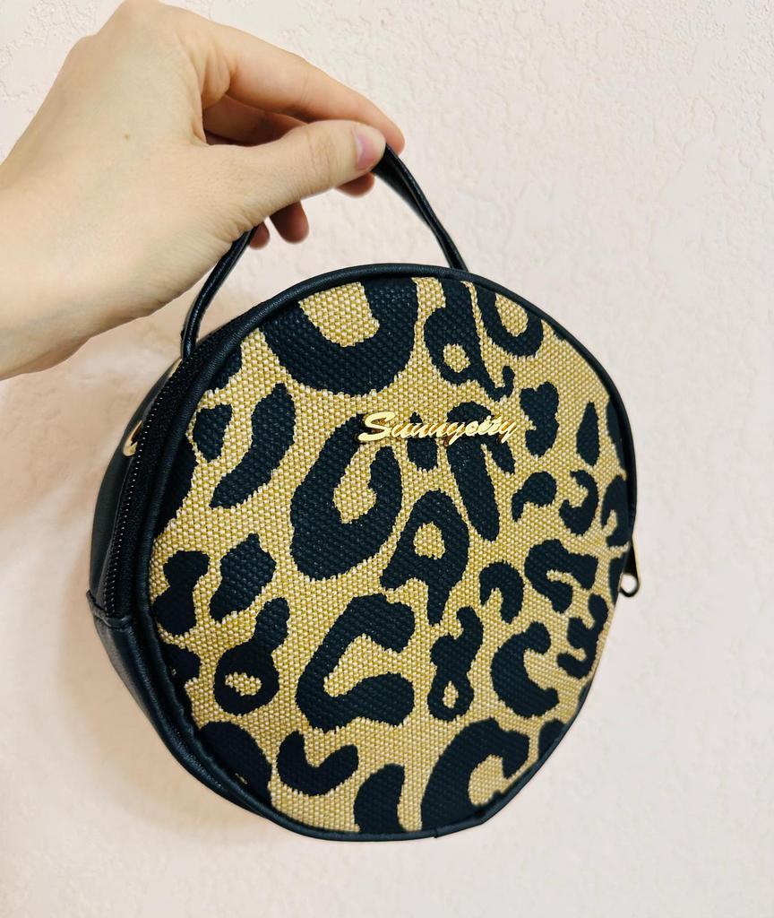 This round - shaped cross - body bag exudes a vintage and stylish charm. The front is adorned with a bold leopard - print pattern in black and beige, creating a striking visual appeal. The contrasting brown PU trim around the edges adds a touch of sophistication and neatly frames the print. The bag also features a small, elegant brand logo, subtly integrated into the design. The gold - toned hardware, including the zipper and detachable hook - and - loop fasteners, adds a luxurious touch, enhancing the overall aesthetic.