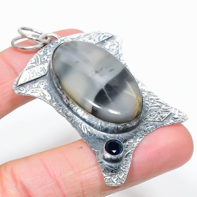 Natural Ocean Fume Agate,Blue Topaz Stone 925 Sterling Silver Pendant 2.68" B9f66