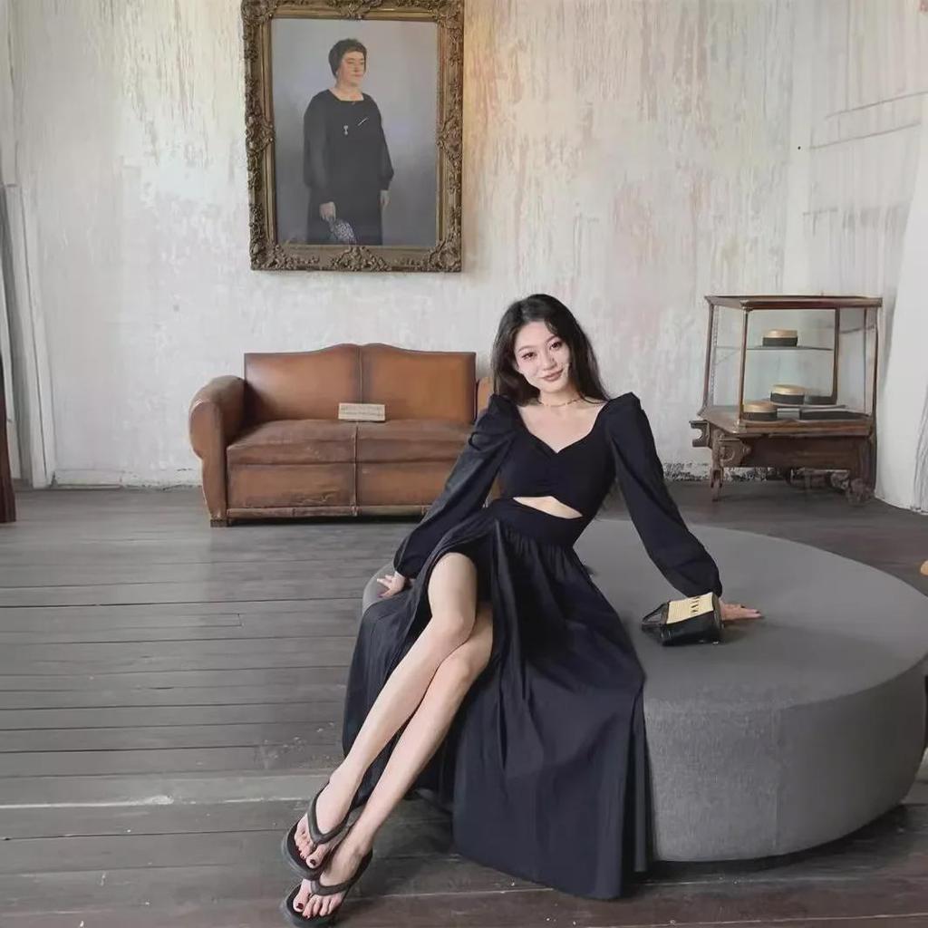 2024 Spring Black V-Neck Long-Sleeve A-Line Dress with Waist and Slit