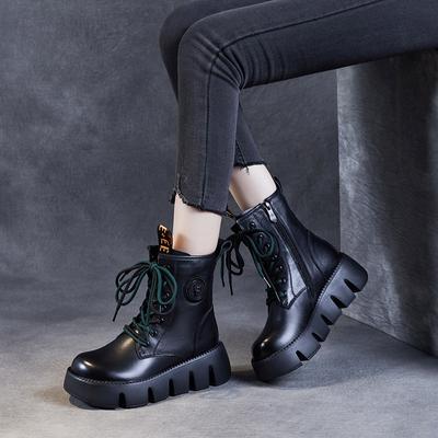 2024 New Snow Boots for Women Vintage Round Toe Warm Plush Lace-up Platform Shoe Solf Leather Anti Slip Thick Bottom Short Boot