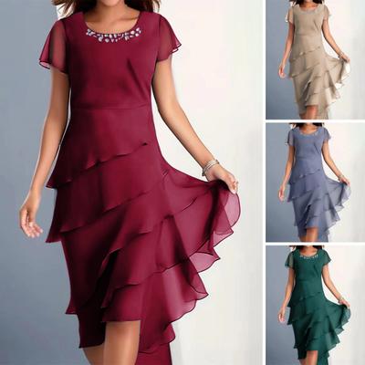 Women Elegant Dress O-Neck Beaded Decor Short Sleeve Midi Dress Layered Cake Hem Flowy Dress Party Wedding Guest Dress