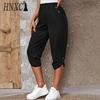 HNXC Women's Cropped Trousers with Pockets and Elastic Waist, Summer Buttons