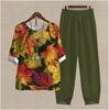 Design: Relaxed-fit short sleeve top paired with wide-leg pants, featuring a vibrant floral print in blue and yellow-green tones.