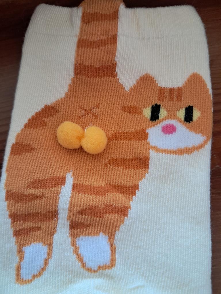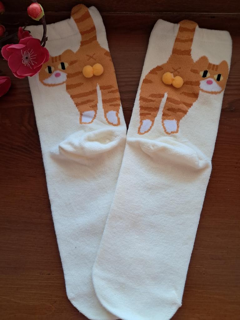 Cat socks ✨ Pack with two pairs of cat socks in size for those who wear 38-39. They are quite warm, mid-calf length, and look very cute since they are cats and have two small pompoms as the kitten's tail.. One is white with the ginger kitten and the other black with the tabby grey kitten. It arrived very quickly in less than a month by tracking number until delivery.