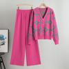 Fashion Knitted Suit Women's Autumn and Winter Jacquard V-neck Cardigan Wide-leg Pants Thin Two-piece Set