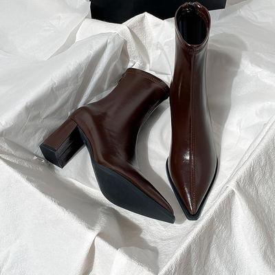 Short Boots Women's Small Fleece Pointed Skinny Boots Thick Heel High Heel Elastic Back Zipper Ankle Boots Brown