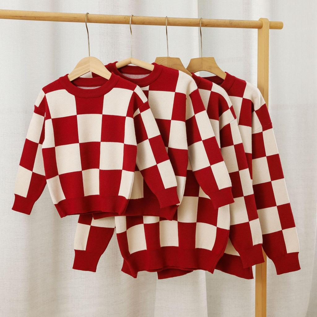 Plaid Red Knit Family Sweater: Autumn-Winter Influencer Style for Parents and Kids