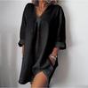 This stylish V-neck dress is perfect for summer, offering a blend of comfort and elegance with its three-quarter sleeves. Crafted from a breathable cotton and linen mix, it ensures a lightweight and airy feel for those warm days. The dress features convenient pockets, adding a practical touch to its chic design. Ideal for casual outings or leisurely strolls, this dress provides a versatile addition to any wardrobe.