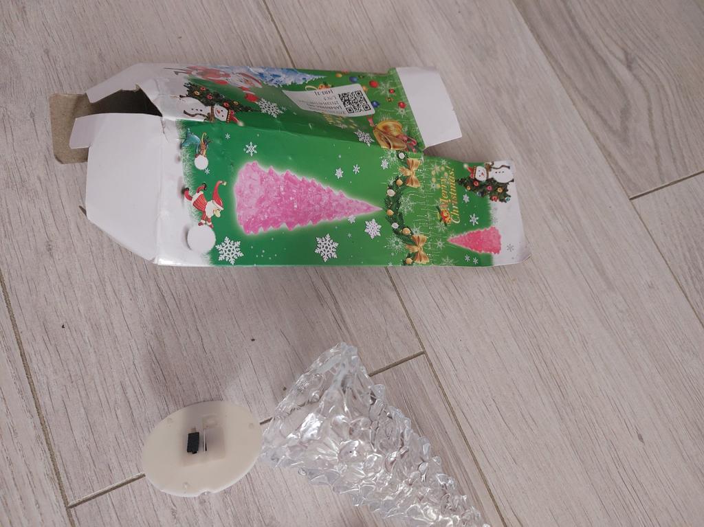 The box is crushed, a crack along the fir tree