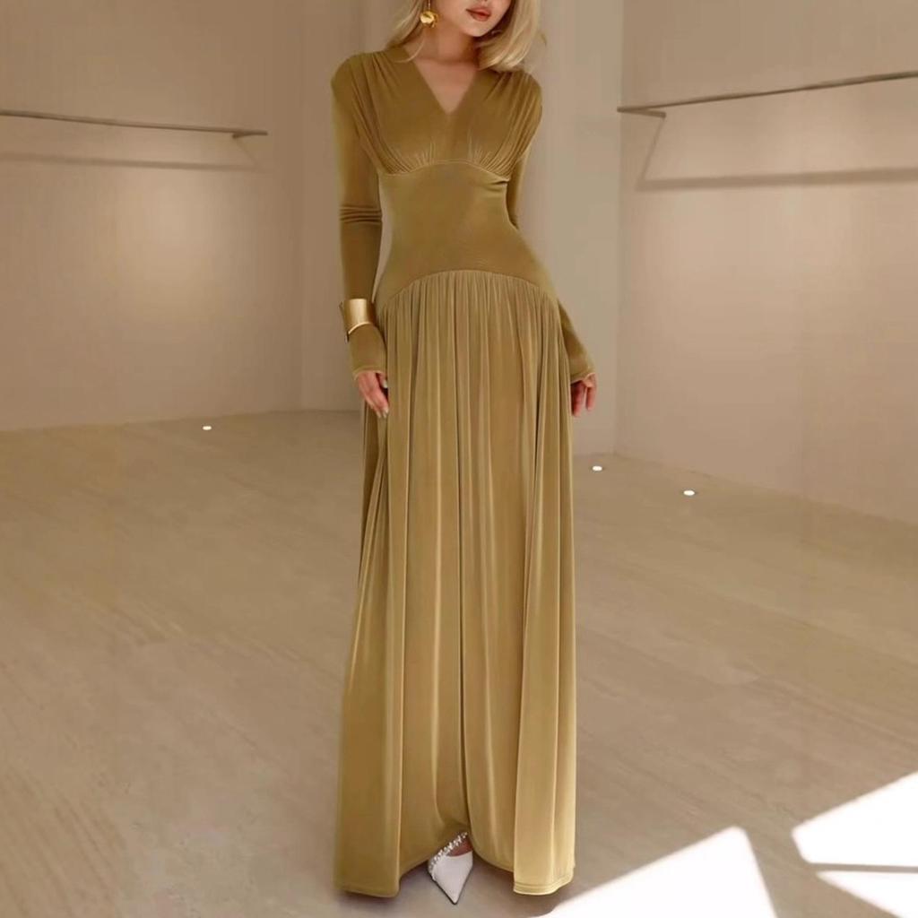 European & American Women's Elegant Long-Sleeved Velvet Dress - Shiny, Waist-Cinching Winter Fashion