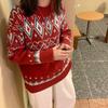 Korean Style Red Christmas Sweater for Women - Loose, Retro Pullover with Round Neck, Knitted for Autumn and Winter