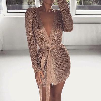 Women's Deep V-Fold Ribbon Dress, Long Sleeved Sequin Wrapped Hip Dress