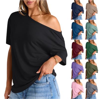Women's Fashion Off-Shoulder T-Shirt Solid Color Loose-Fit Short Sleeve Top