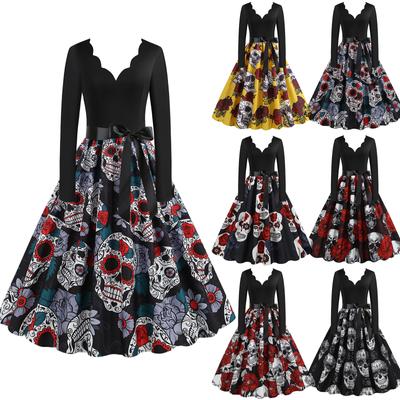 Women's Vintage Classic Dress Neck Waist Bow Tie Long Sleeves Halloween Print V Neck Swing Dress