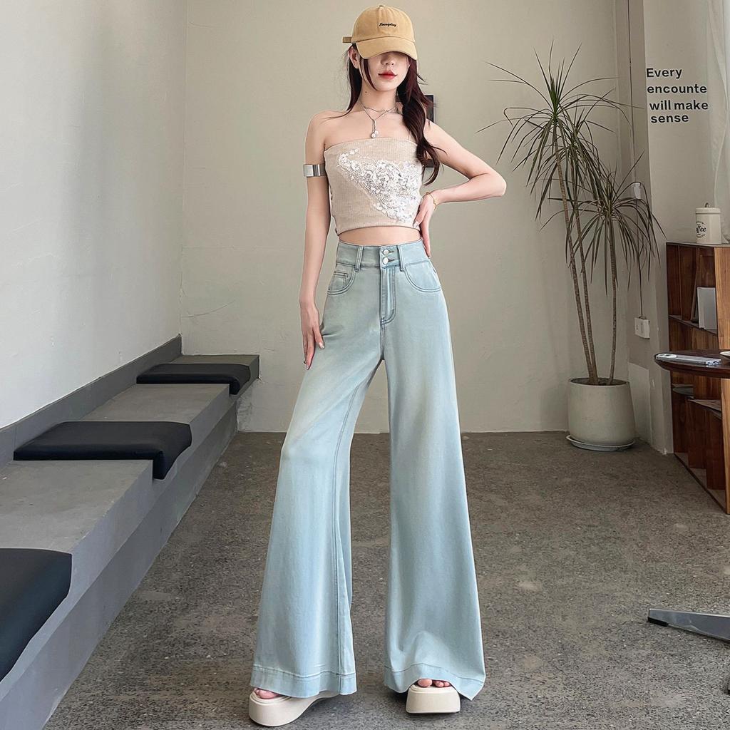 Light Blue Sky Silk Wide-leg Flared Jeans for Women In Summer High-Waist Comfortable Fit Drooping Without Legs Ice Silk Micro-flare Pants
