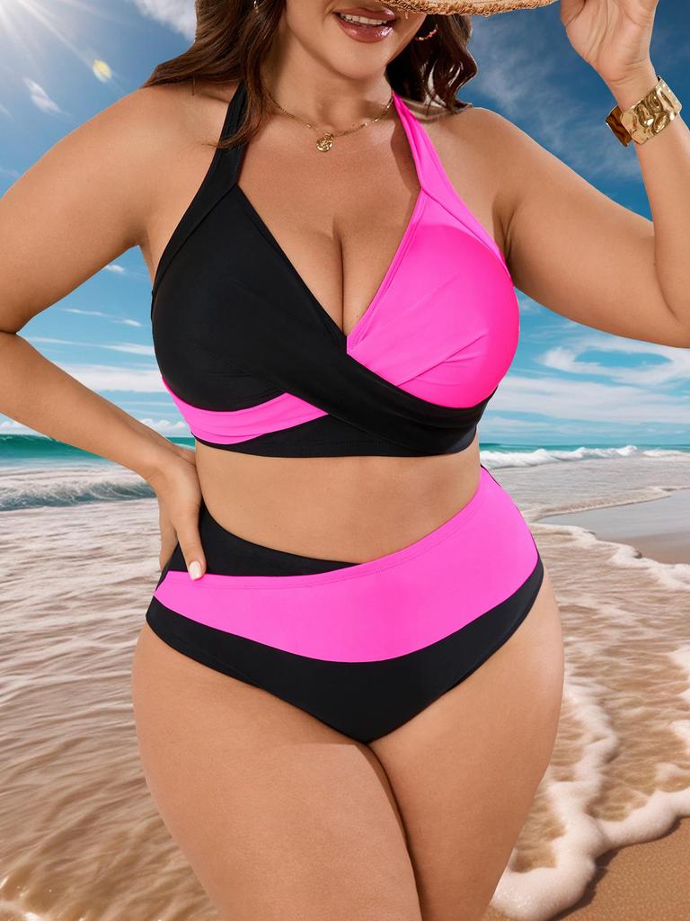 Introducing a stylish and flattering swimwear option for women seeking comfort and elegance at the beach or pool: a plus size two-piece swimsuit designed with a chic and modern color block pattern. This swimsuit features a halter crisscross top that offers excellent support and enhances the bust, while the high-waisted bottoms provide tummy control for a confident fit. Made from high-quality polyester material, this swimwear is both durable and comfortable, making it perfect for enjoying sunny days in style.