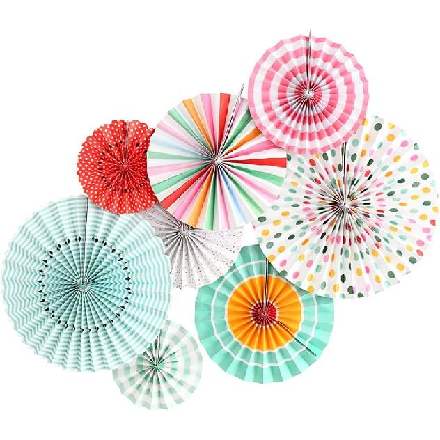 【PACKAGE INCLUDES】8 pieces different sizes of colorful hanging paper fans ( 16inch×2, 12inch×2, 10inch×2, 8inch×2), the matching of different sizes and colors makes the decoration more interesting and stylish.
