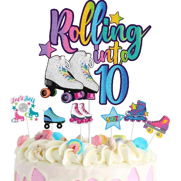 7Pcs Rolling Into 10 Theme Cake Toppers Sets Roller Skate Happy 10th Birthday Themed Set Cake Decoration Girls Club Rolling 10 Years Old Supplies