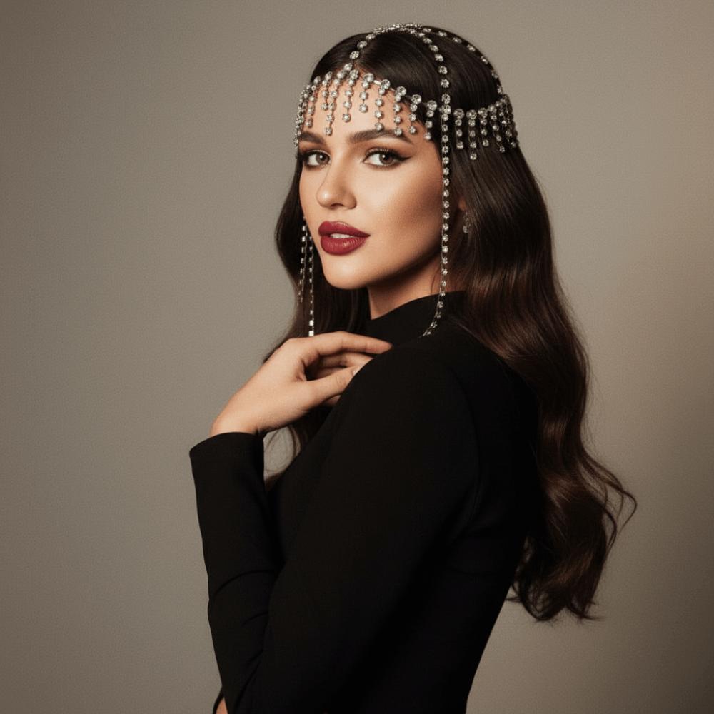 Flash Rhinestone Cap Headpiece Full Rhinestone Inlay Tassel Headband Stage Performance