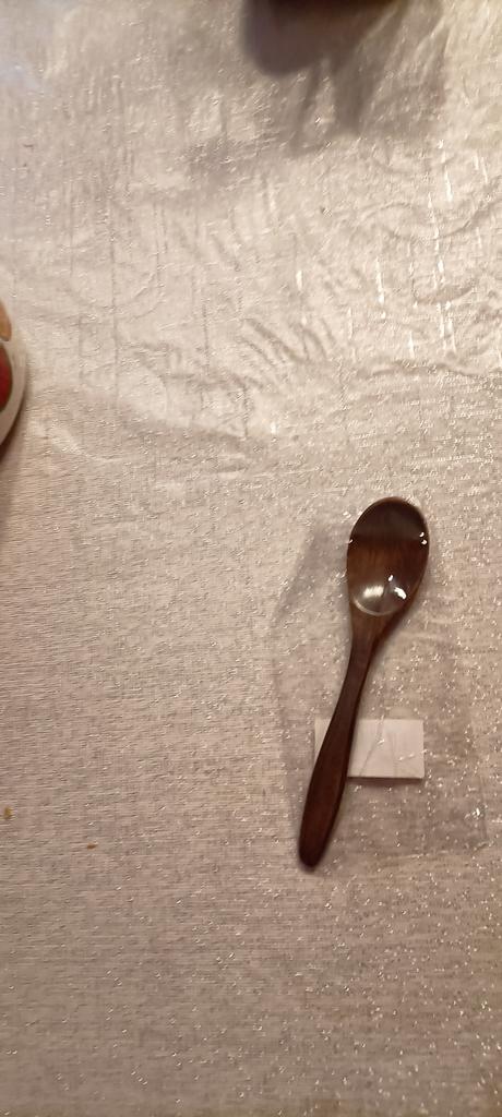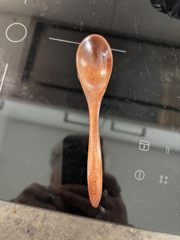Mała drewniana łyżka, ładnie wypolerowana. Rozmiar to łyżeczka. Pewnie przyda się do suchej karmy, nie wiem ile razy wytrzyma wielokrotne zmoczenie.