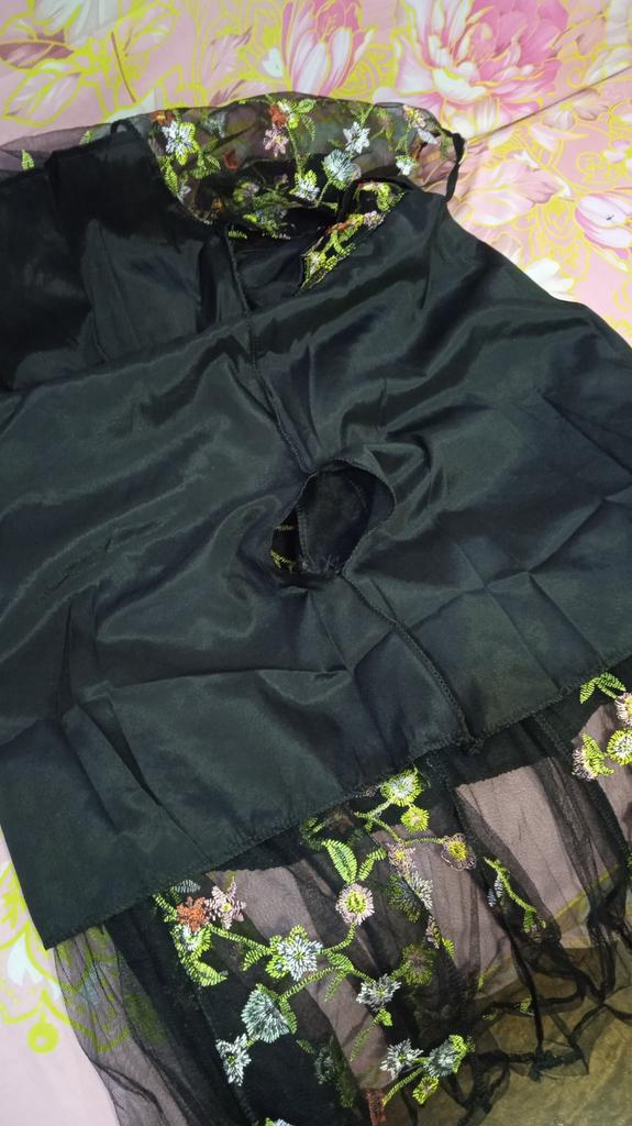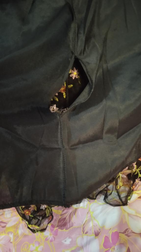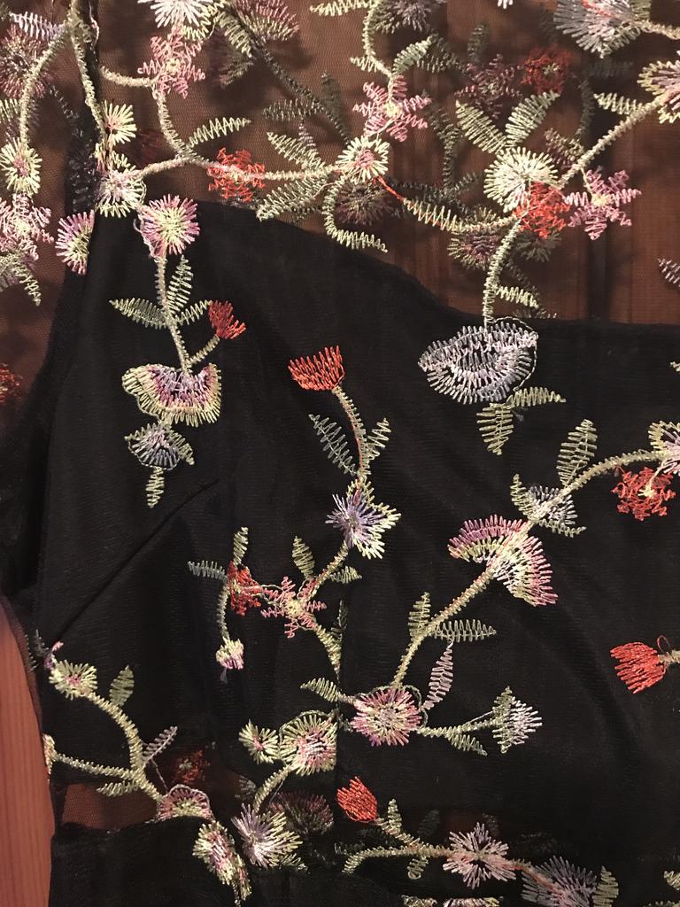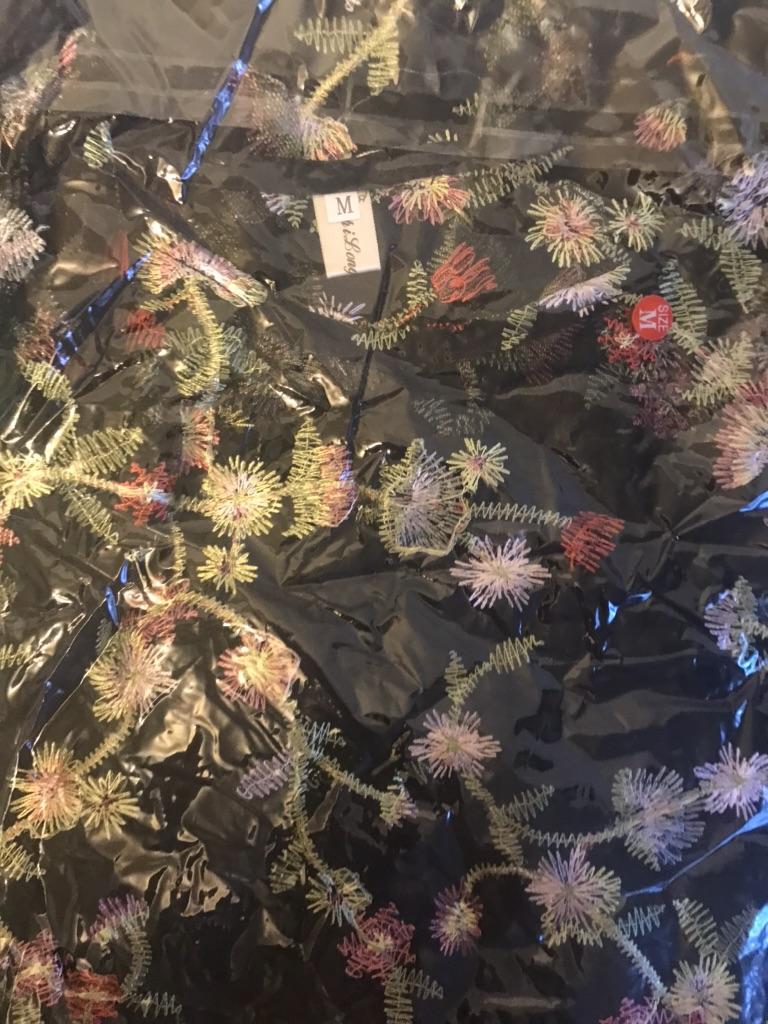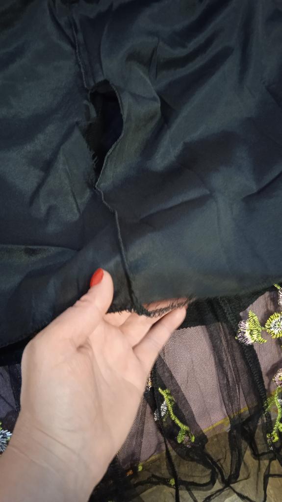Prosta tkanina siateczkowa z pięknym haftem i nieprzezroczystym plastikowym podkładem pomiędzy. Bardzo ciasny w ramionach, bez rozcięcia w talii. Zawieszony jak worek