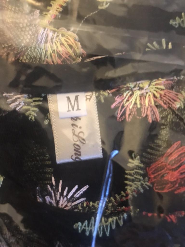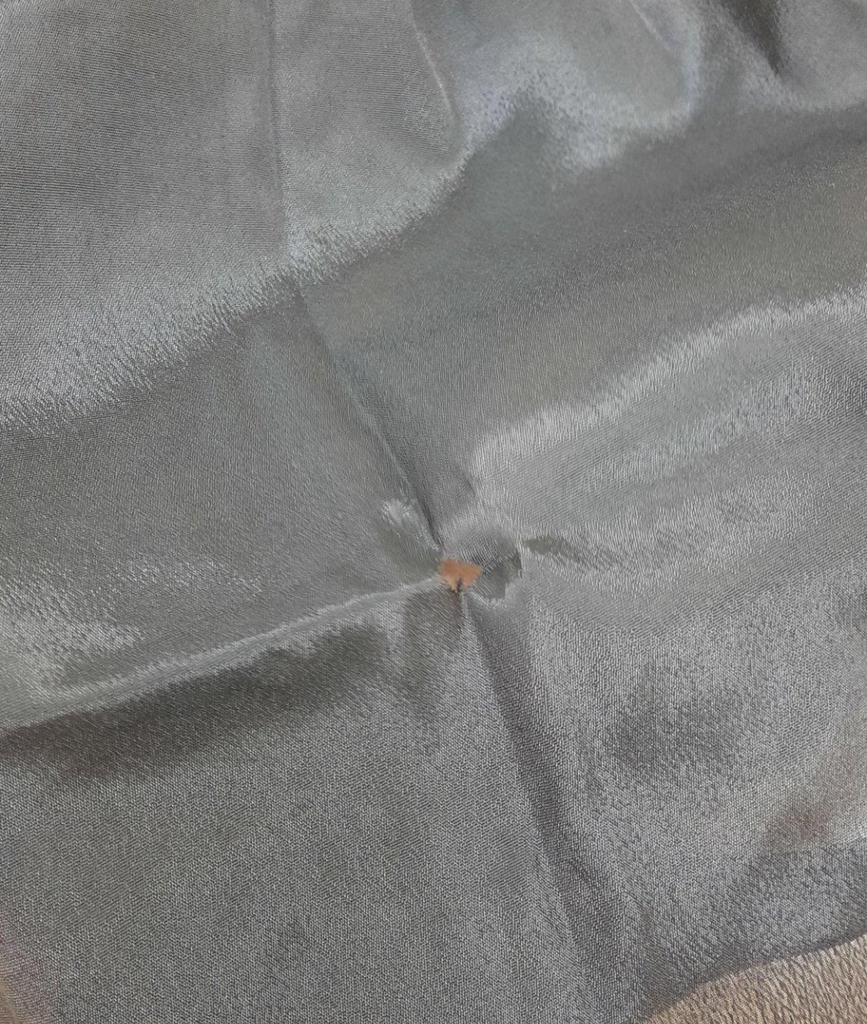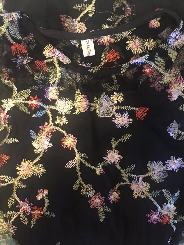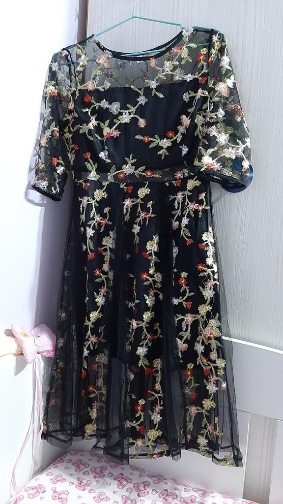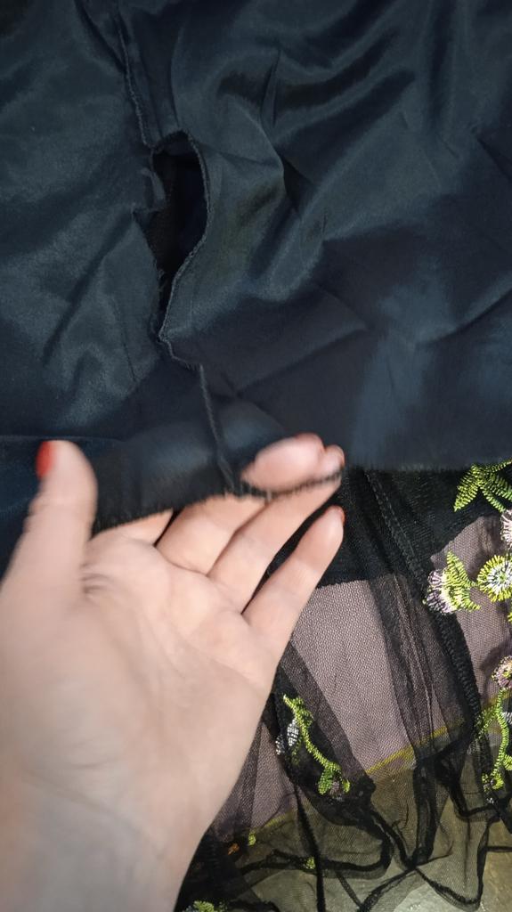 Prosta tkanina siateczkowa z pięknym haftem i nieprzezroczystym plastikowym podkładem pomiędzy. Bardzo ciasny w ramionach, bez rozcięcia w talii. Zawieszony jak worek