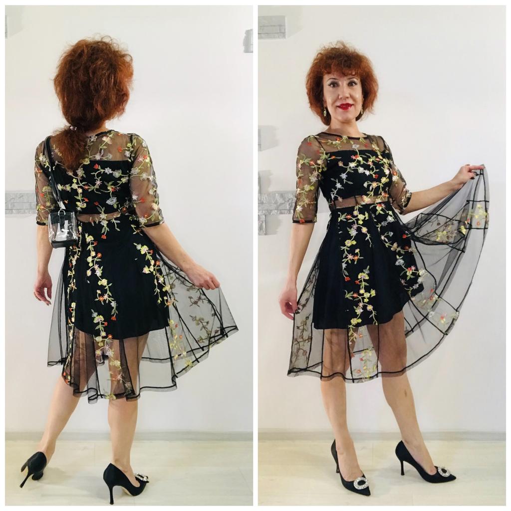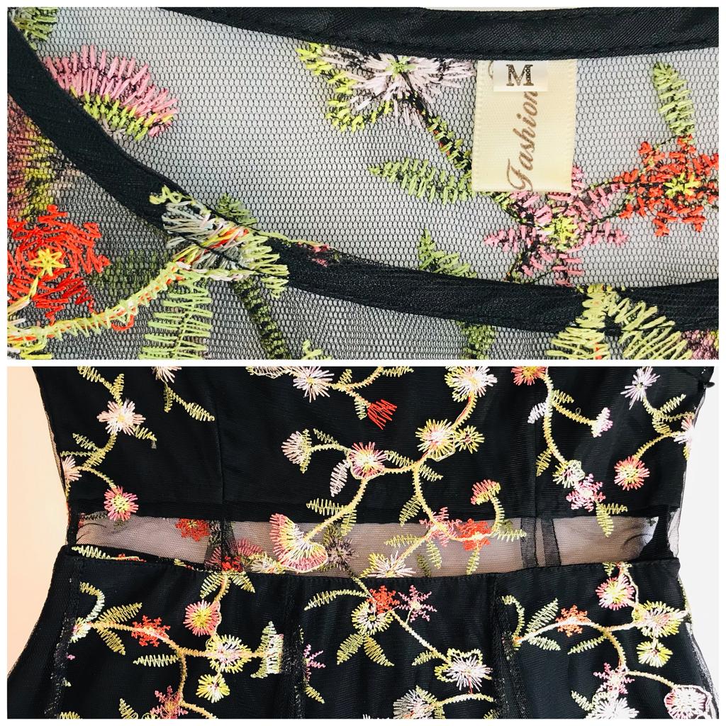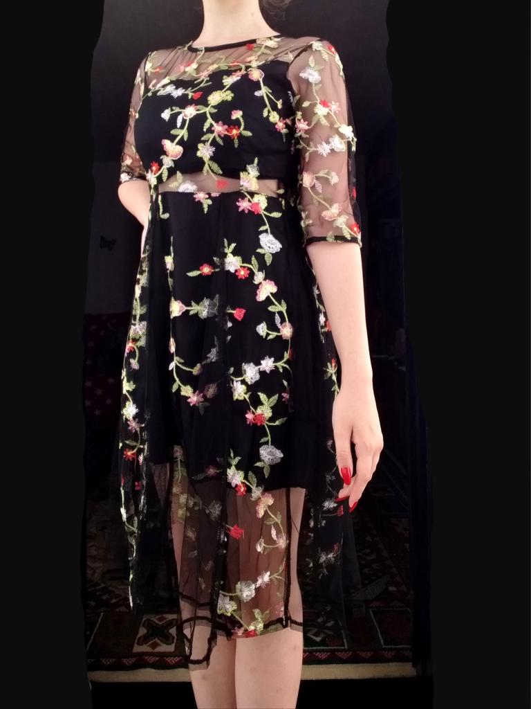 Lady Mesh Haft Kwiatowe seksowne sukienki Kobiety Elegancka sukienka imprezowa Transparent O Neck Plus Size