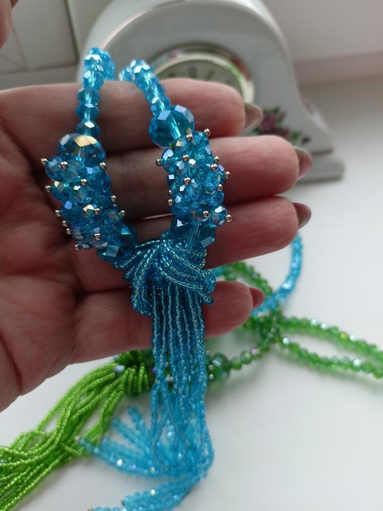 W pełni zgodna z opisem, bardzo efektowna dekoracja wykonana z koralików i niebieskiego szkła
