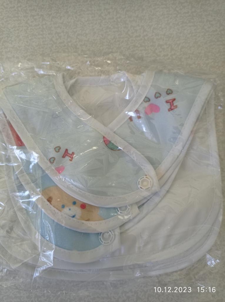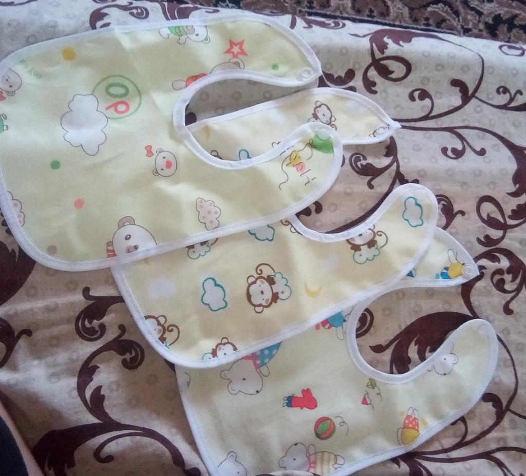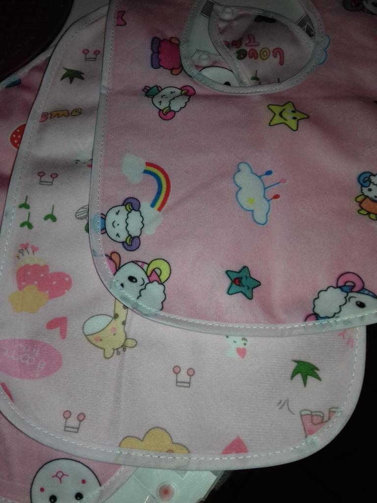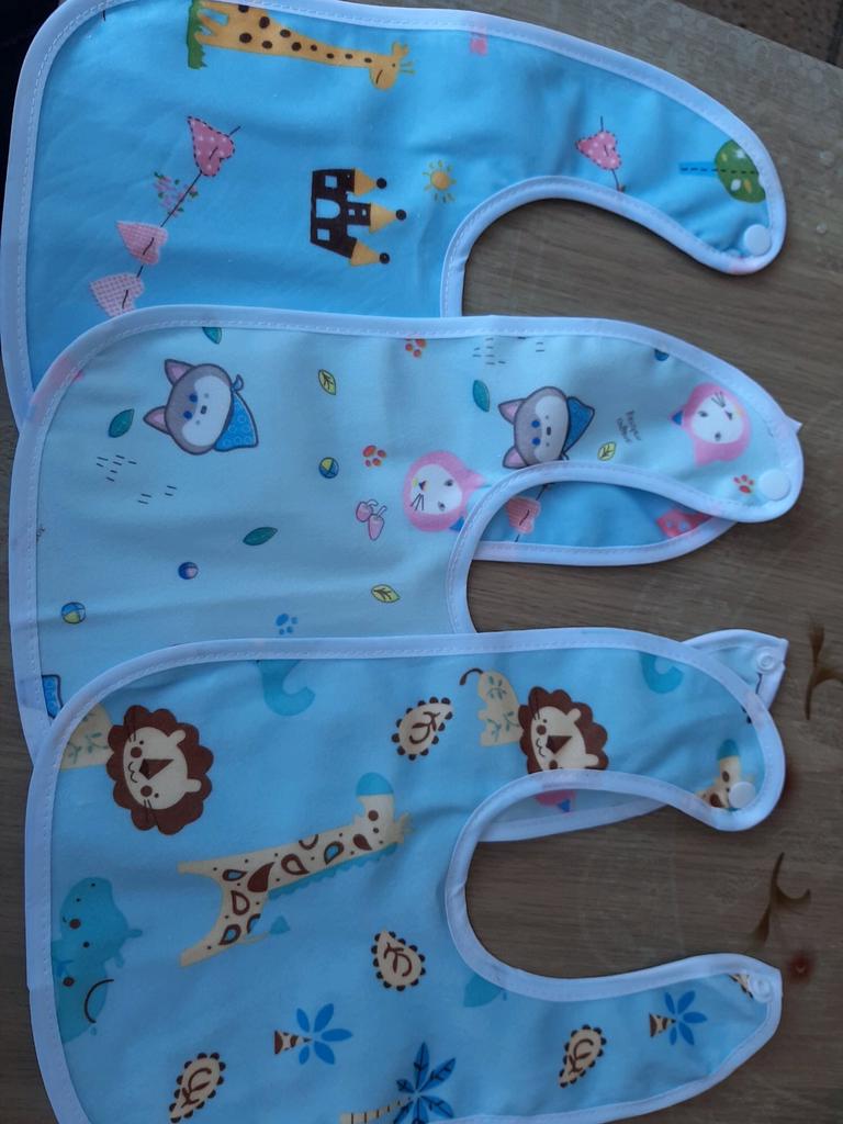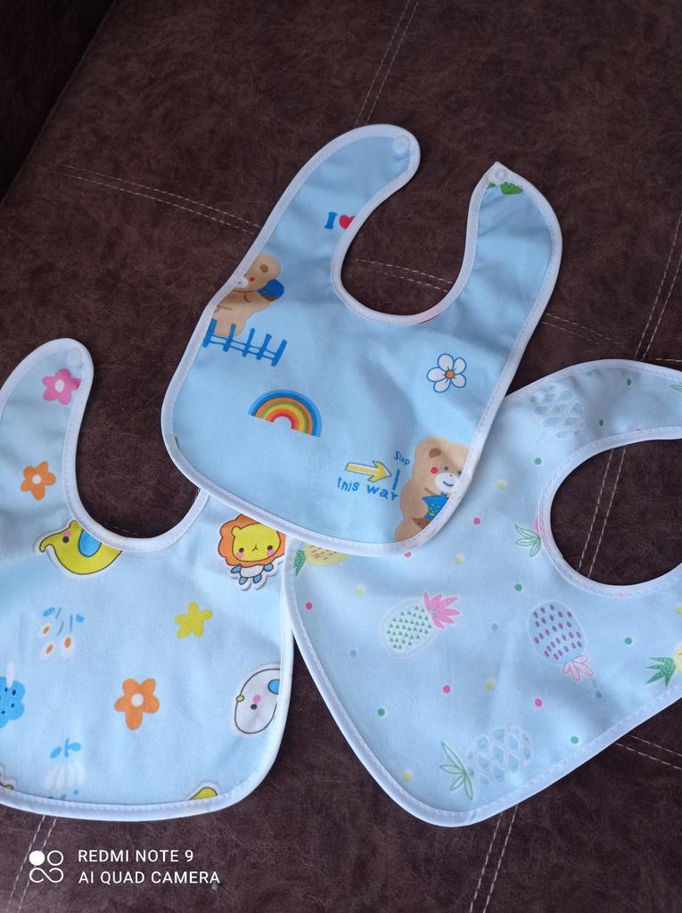 Przyszła łączona paczka. Tkanina z jednej strony jest syntetyczna, z drugiej cerata. Przyciski działają. Dwa z trzech śliniaków mają ten sam nadruk. Dziecko ma miesiąc. Recenzję dodam później, po użyciu. Dzięki Jum!