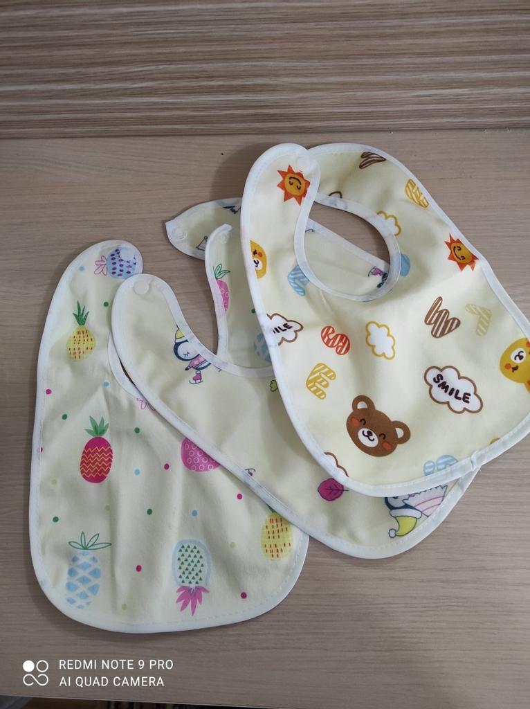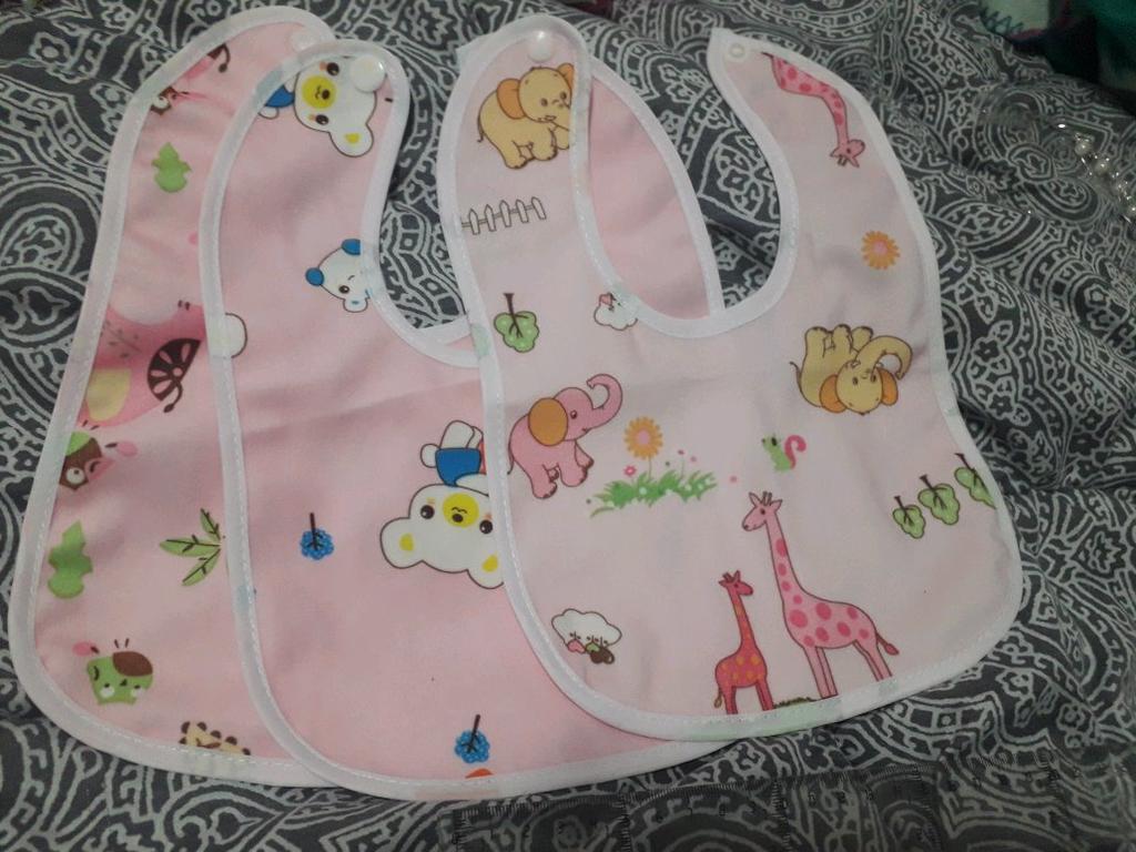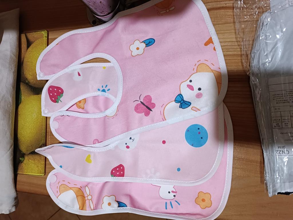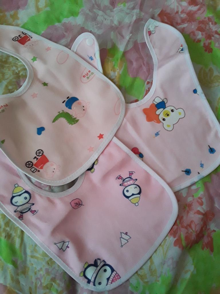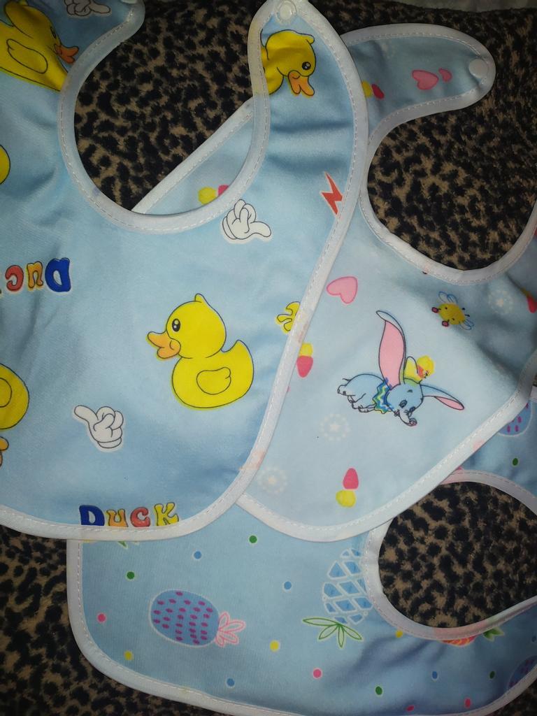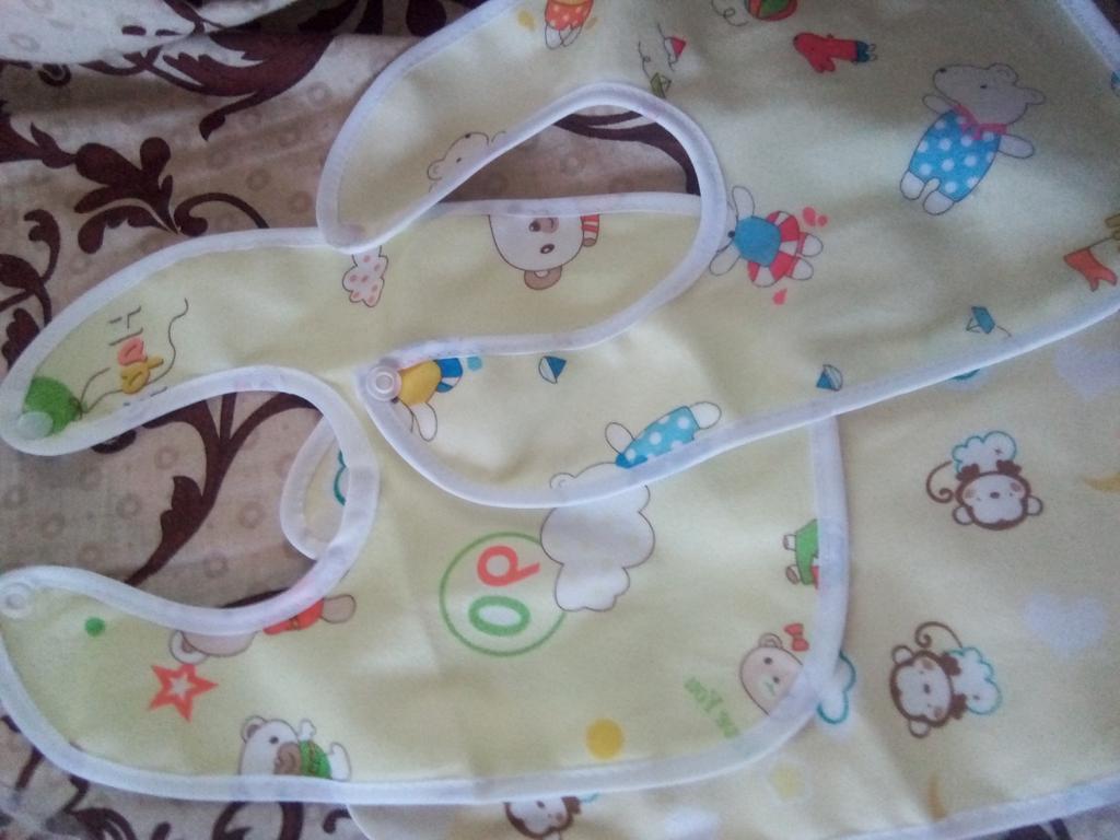 Przyszła łączona paczka. Tkanina z jednej strony jest syntetyczna, z drugiej cerata. Przyciski działają. Dwa z trzech śliniaków mają ten sam nadruk. Dziecko ma miesiąc. Recenzję dodam później, po użyciu. Dzięki Jum!