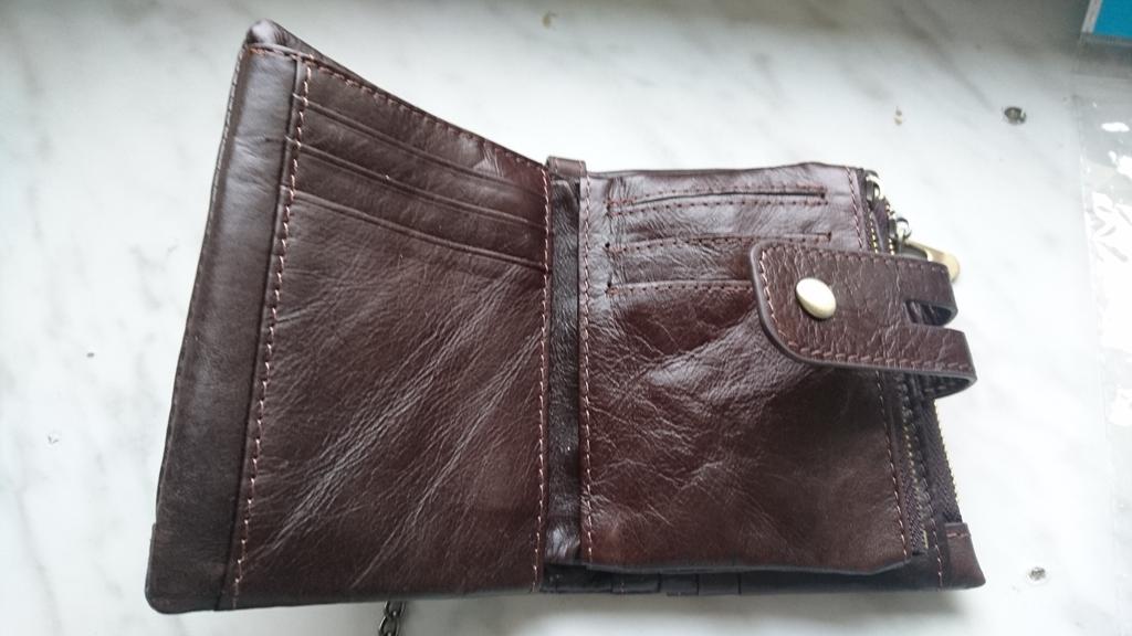 Dużo różnych zakładek, dwa schowki zamykane na zamek błyskawiczny. Trochę za krótki i zbyt delikatny łańcuszek ale ogólnie portfel wart swojej ceny.