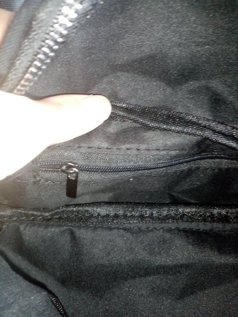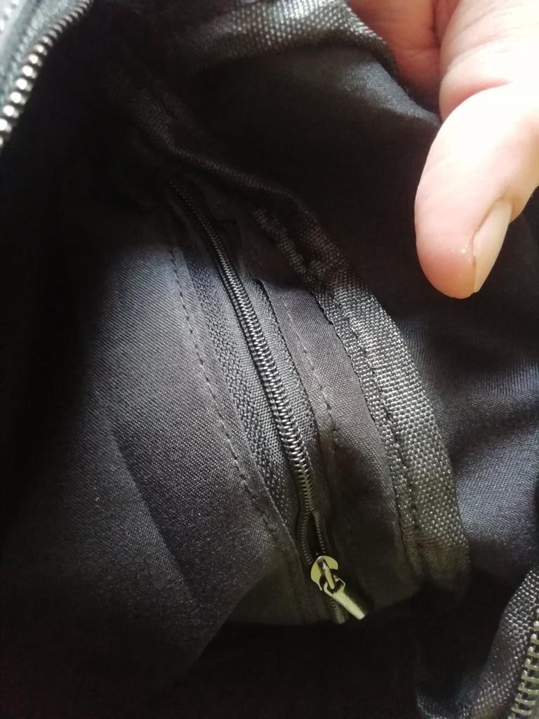 Wewnątrz znajduje się mały zamek błyskawiczny na pieniądze lub klucze! Podoba mi się ten styl. Myślę, że materiał z tyłu został nieco uszkodzony podczas transportu.