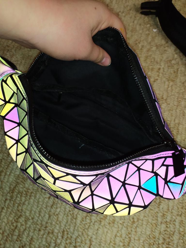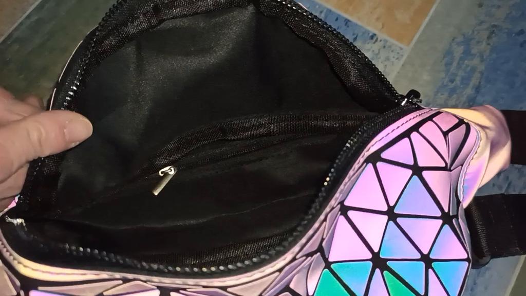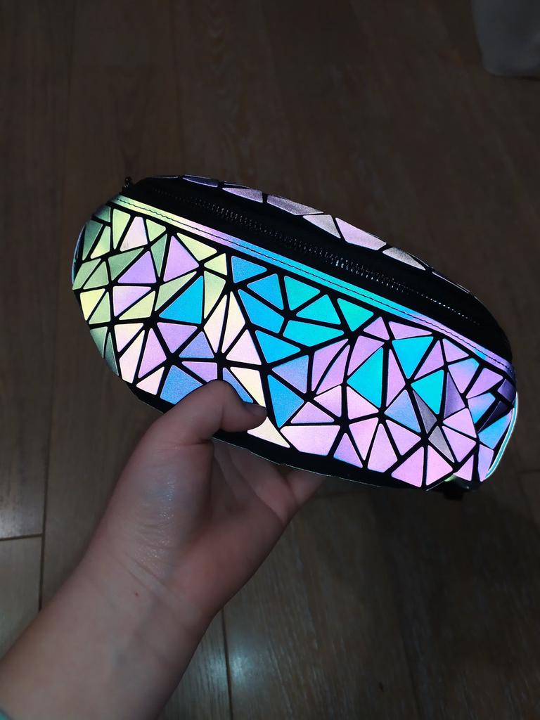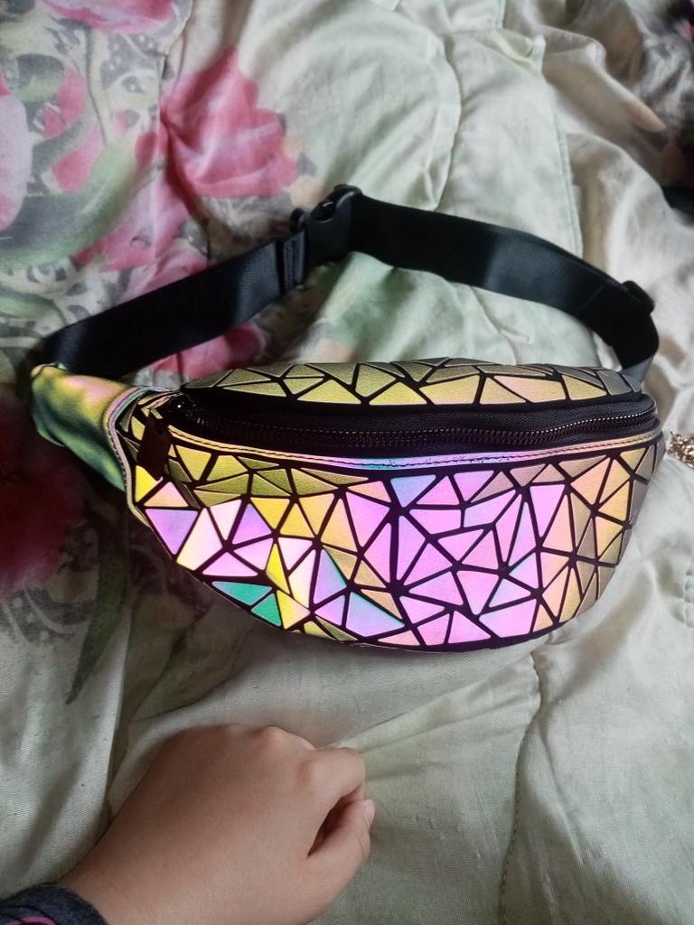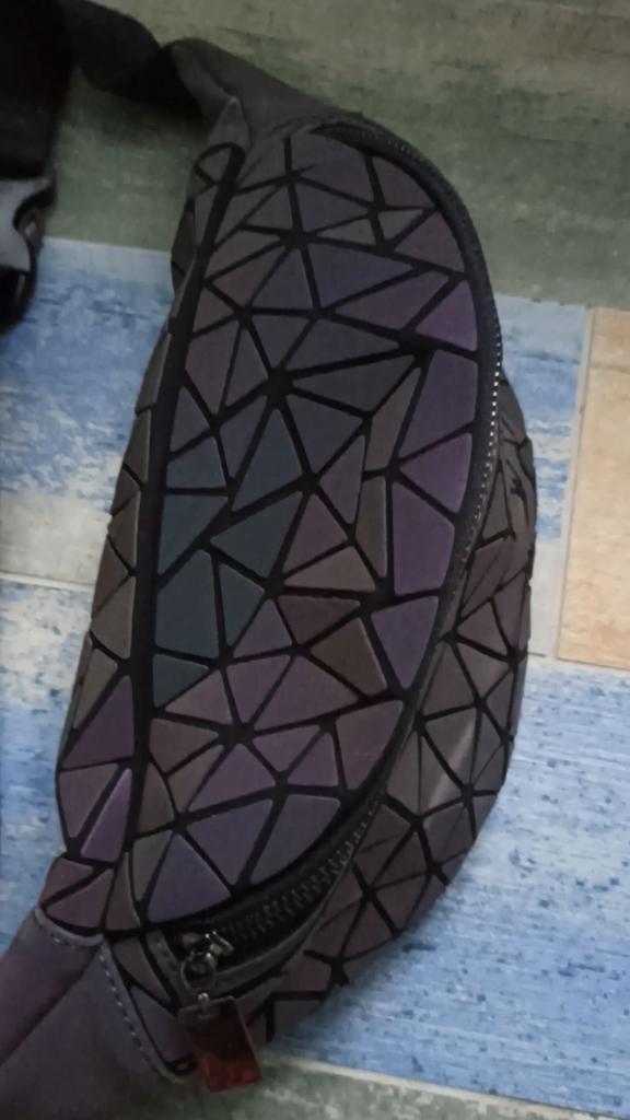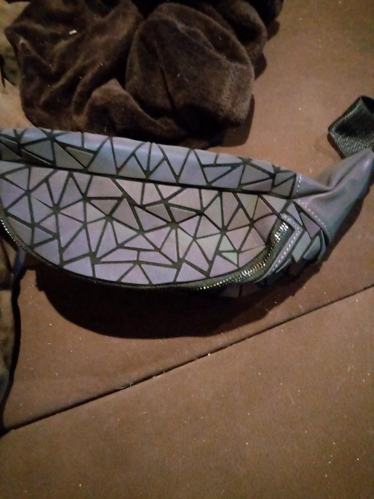 Materiał odblaskowy pod wpływem bezpośredniego skupienia sztucznego światła. Warto podkreślić, że w rzeczywistości nie wygląda to tak jasno i kolorowo, to przez ekran mobilny nabiera tych cech, przynajmniej w ciągu dnia. Może w nocy, przy mocnym świetle punktowym, też wyglądałoby to tak intensywnie.. Uwielbiam produkty wykonane z tego materiału! Miałam już torebkę i teraz zdecydowałam się na tę saszetkę. Nie są to najtańsze produkty w Joom, ale stosunek jakości do ceny jest znacznie wyższy niż przeciętny.