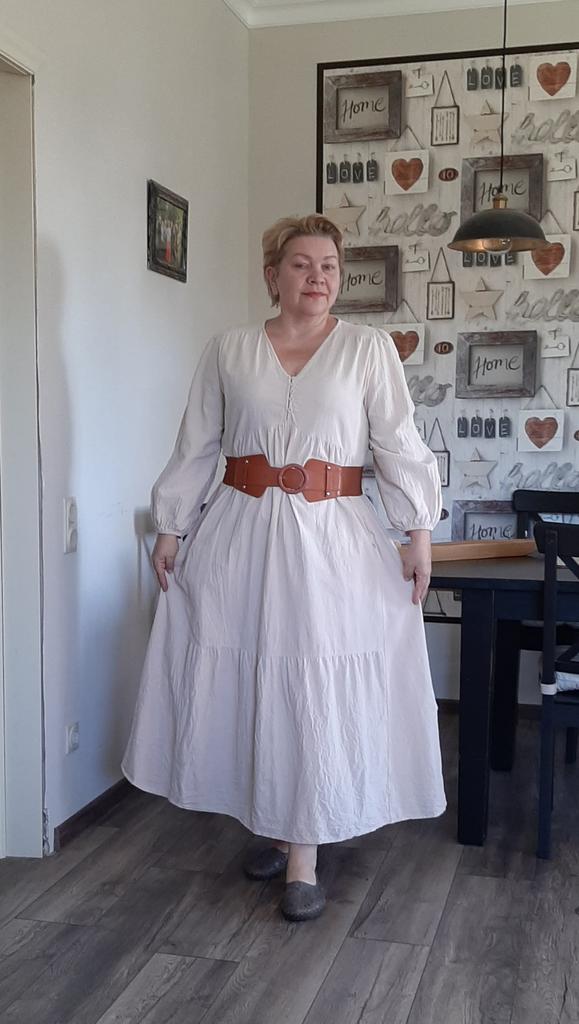 Sukienka dotarła w ciągu 3 tygodni. Tkanina wygląda naturalnie i jest przyjemna w dotyku. Na mój rozmiar 50 pasuje obwód klatki piersiowej 100 cm - rozmiar L. Tylko talia jest trochę wyższa niż na zdjęciu. Sukienka bardzo mi się spodobała, polecam ją do zakupu
