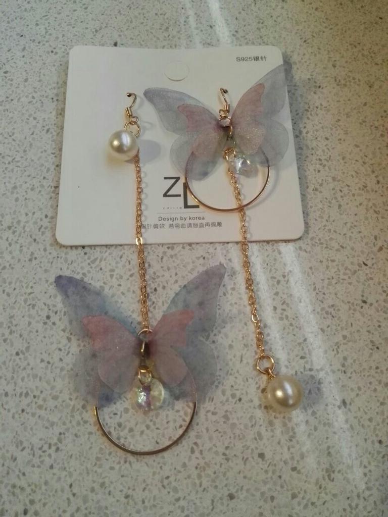 Cudne kolczyki! Są pięknie, zwiewne i lekkie jak... motylki! 🥰🦋🦋 Łańcuszek jest pozłacany i delikatny, ale jego oczka są razem solidnie złączone. Haczyki nie spadają z uszu- dla pewności można domknąć je dołączonymi do opakowania zabezpieczeniami. Motylki zaś wycięto z cienkiej, błyszczącej tkaniny- nie ciążą, za to radośnie podtańcują na wietrze. Zdecydowanie polecam ten produkt od tego sprzedawcy!
