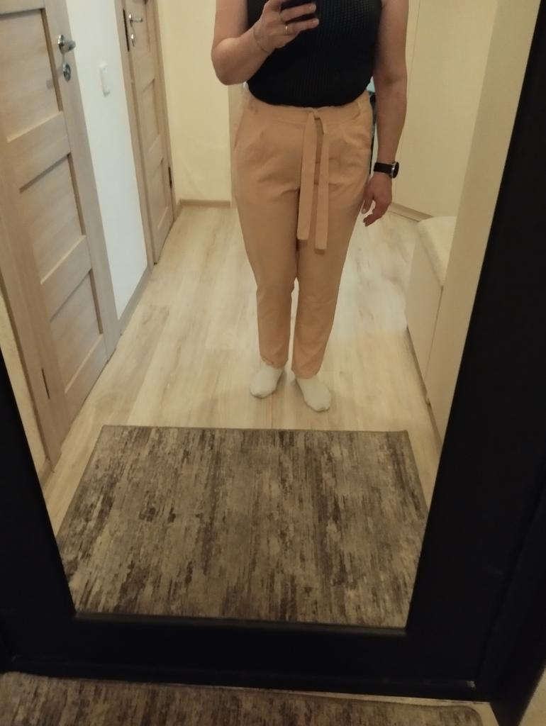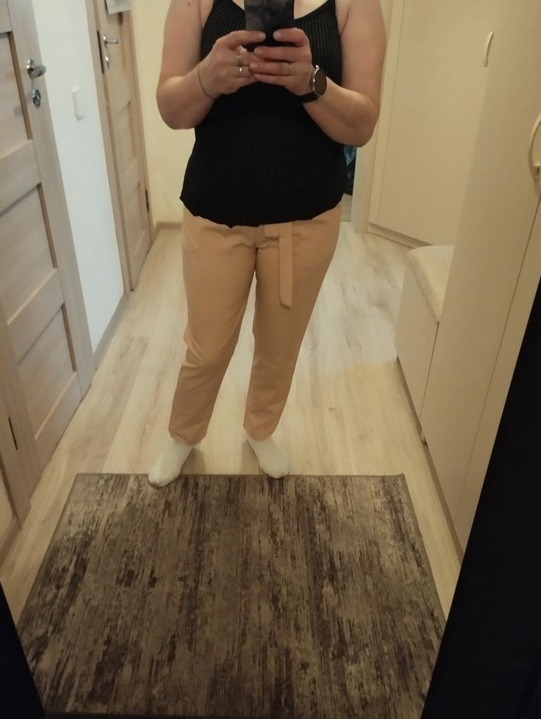 Spodnie normalne, jasne, ale jest jeden niuans, za wysoki stan z przodu, pasek jest pod biustem:))), cienki materiał, odpowiednio bielizna powinna być bezszwowa i cienka.