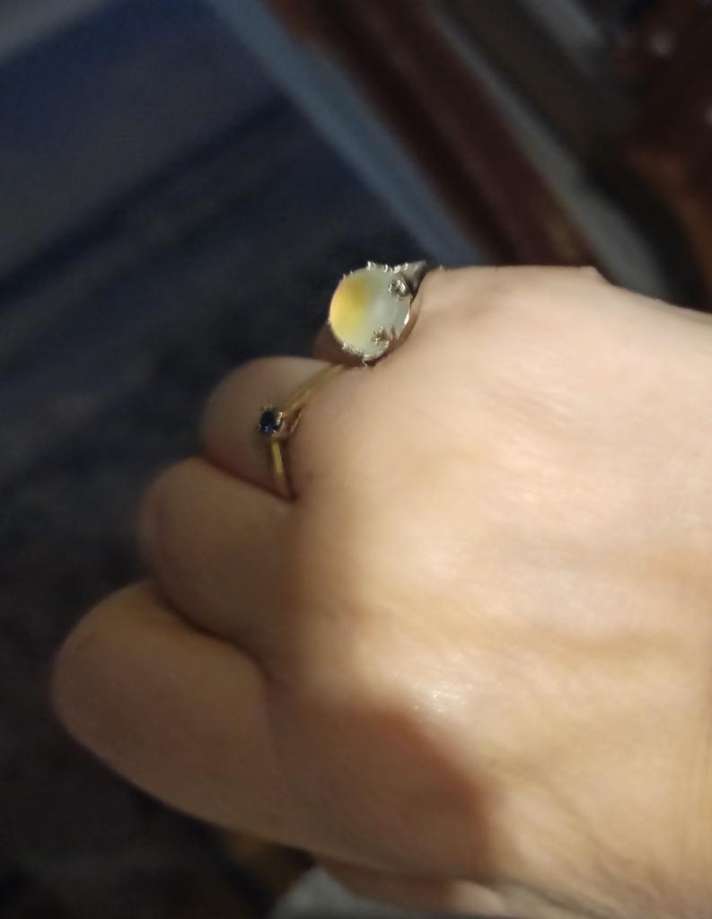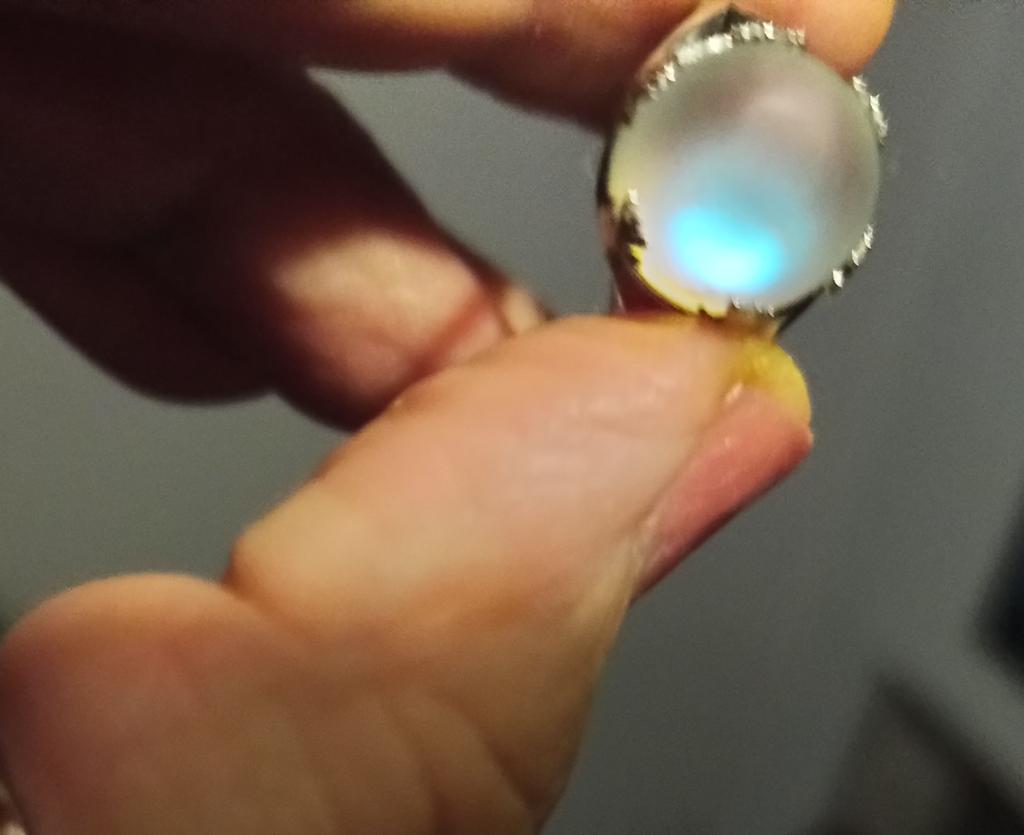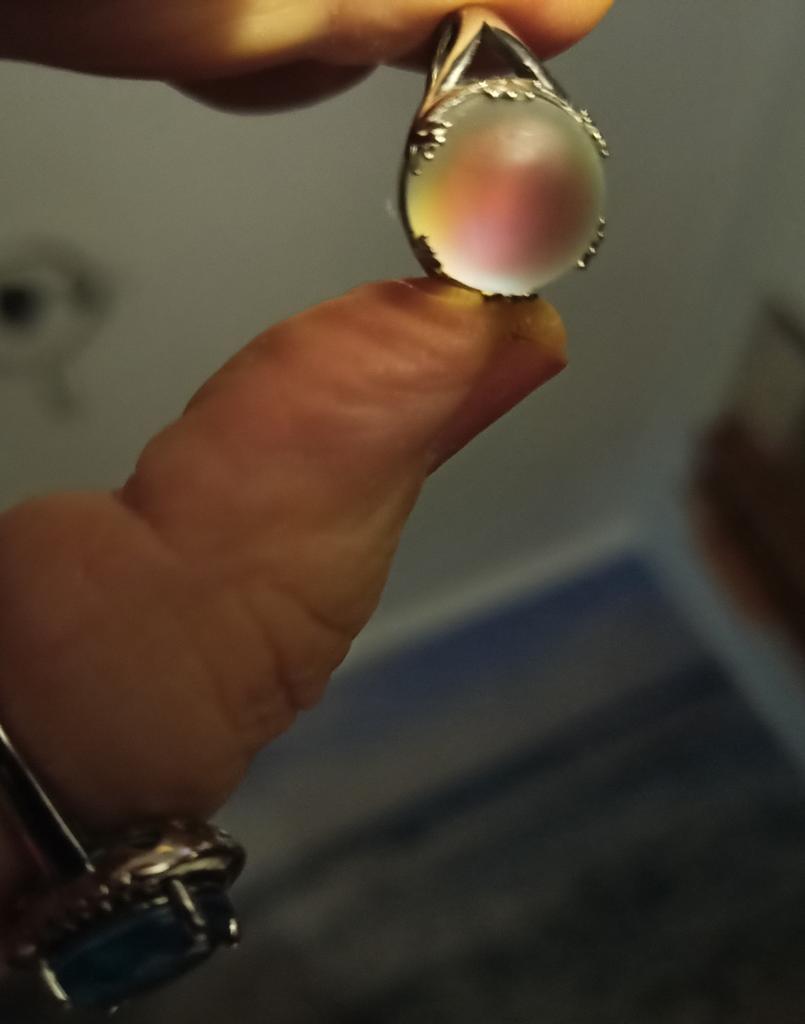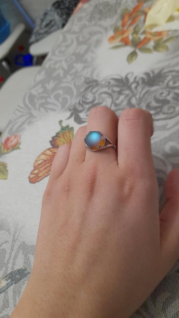 Pierścionek jest absolutnie oszałamiający 💙💜💚 mój ulubiony pierścionek na zawsze 🌺 Uwielbiam niebieski błysk i zależy od światła wewnątrz lub na zewnątrz, jest też niebiesko-zielony, fioletowy i żółty, spektakularny kryształ! Mam też ściereczkę do czyszczenia srebra. Dziękuję 🌺